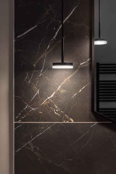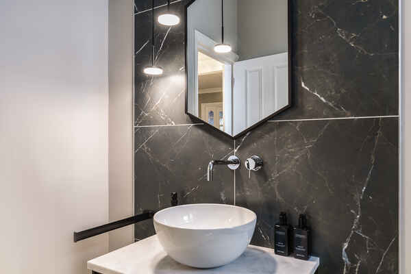 The downstairs bathroom features on-trend black and white theming, hanging feature lights and floor feature lights.