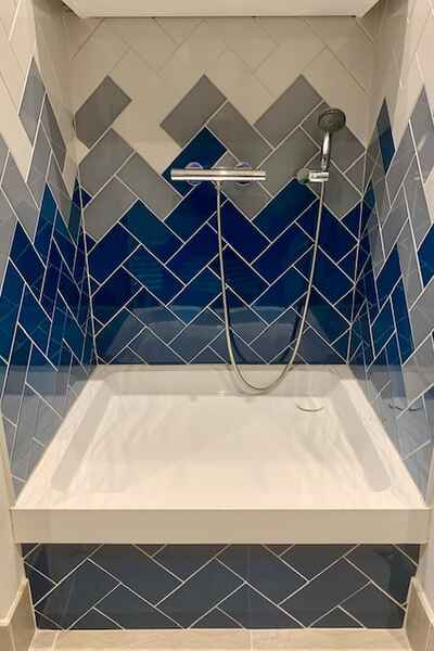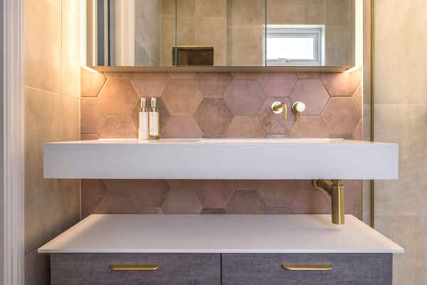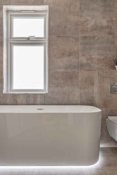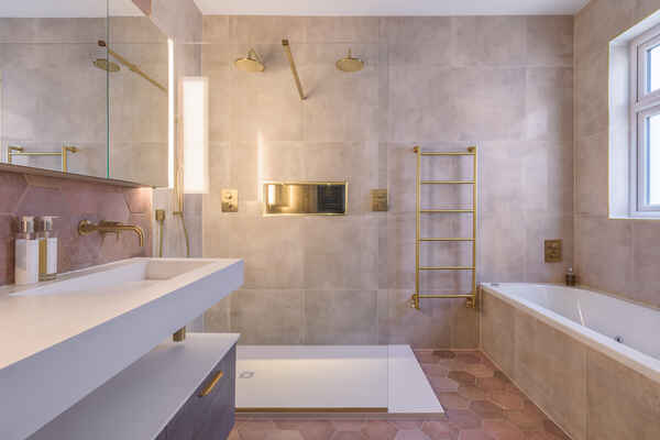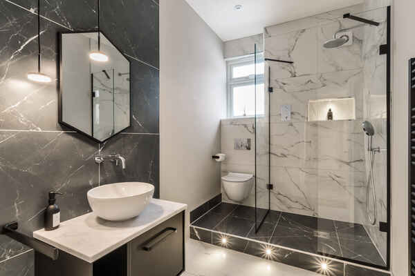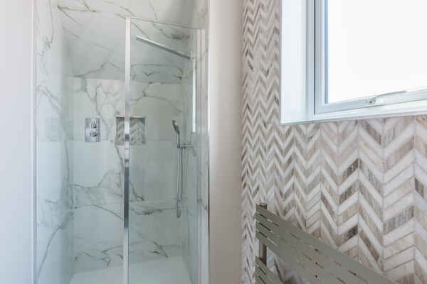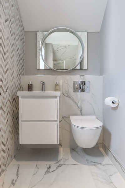 The top floor en-suite showcases stone chevron tiles and round illuminating mirror.