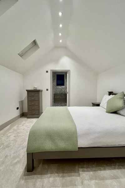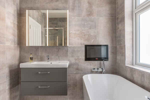 There are 4 bathrooms, all with very unique features: -Master en-suite spa blush bathroom includes: walk-in couples' double head shower, jet bath with lights, bathroom television, modern stone floating basin, rose tiles, brushed brass fittings, vintage feature glass in light up recess and illuminating mirror cabinets.
