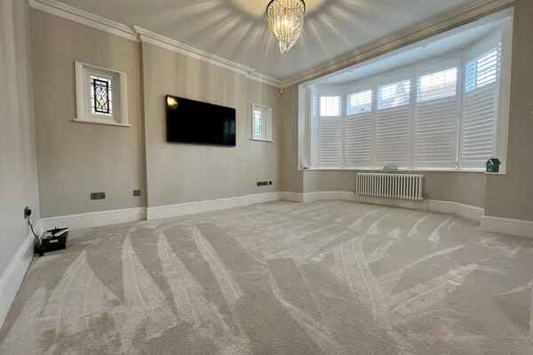 The living space is minimal with neutral carpet and walls and a bay window with fitted shutters.