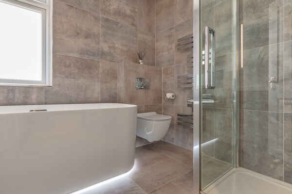 Separate to the bathrooms the house offers a beautiful entrance hall with a modern chandelier, a staircase with stairlights, a utility room with custom made indoor 'dog shower', open plan kitchen/diner with bi-fold doors, 4 bedrooms (1 original Victorian fireplace), lounge with stained glass windows and 1 dressing room.