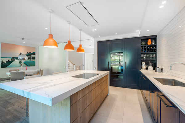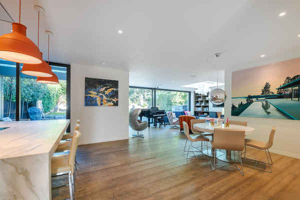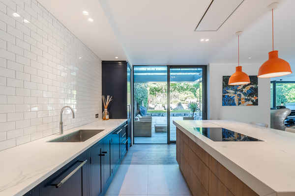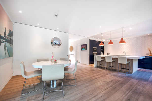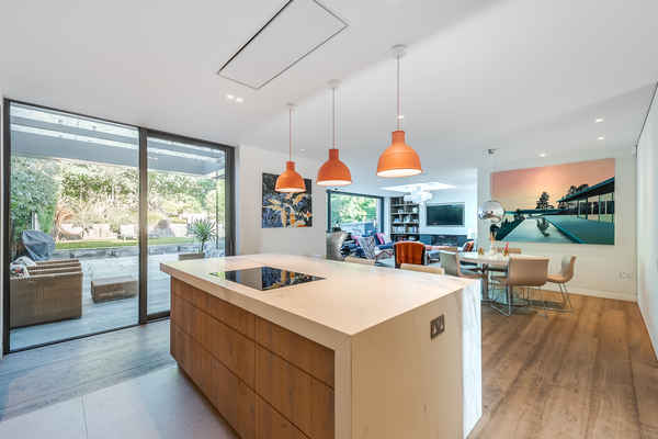 The double width kitchen and dining area is in an open plan style and has plenty of seating both dining and lounging.