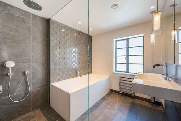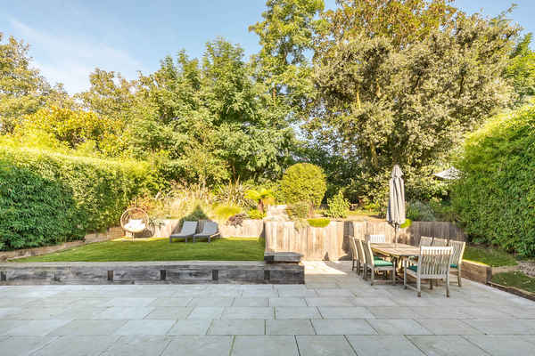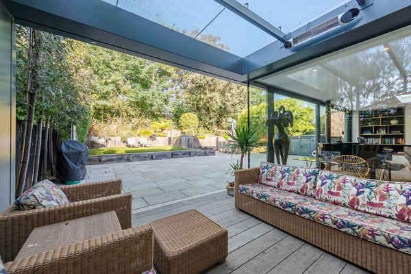 Leading out from the kitchen is a large patio area and stepped garden with outdoor glass roofed seating area.