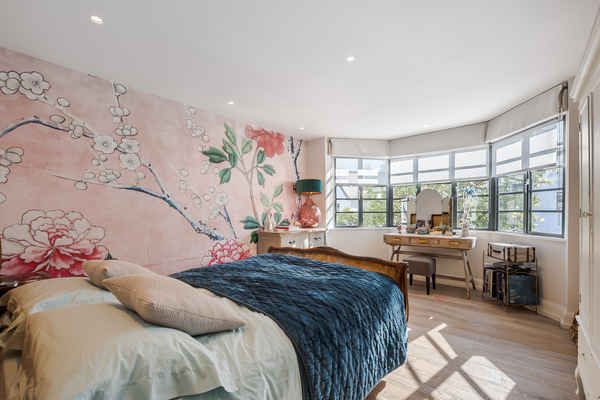 The flooring through-out is neutral wood or carpet and the decor is kept light with bright elements through-out including printed wallpaper and feature walls.