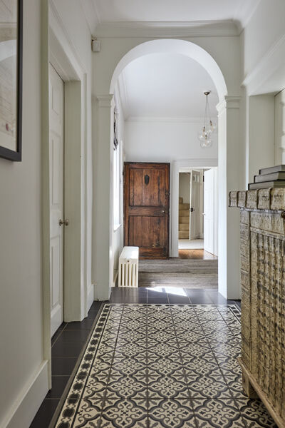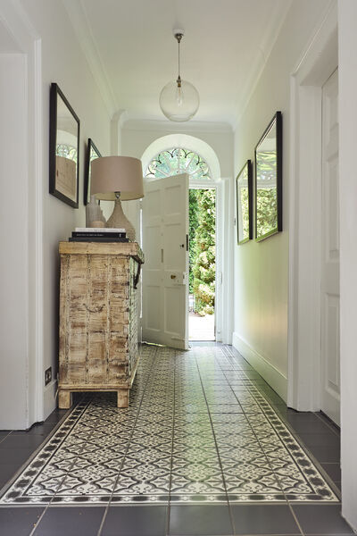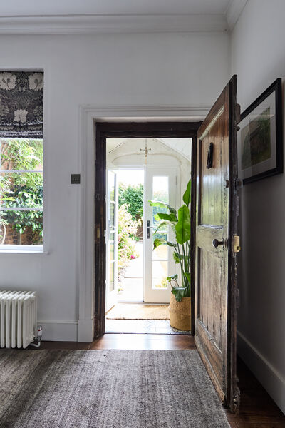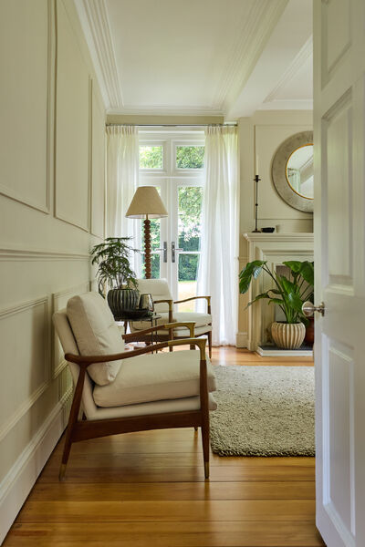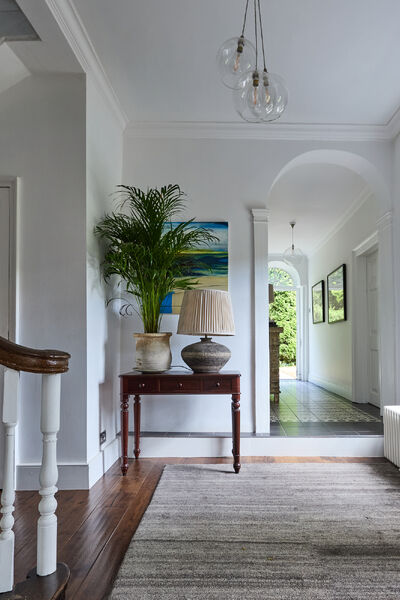 Inside, you'll find two separate lounges, both boasting original fireplaces. One lounge is adorned with elegant panelling, French doors for easy furniture access, and a wooden floor, while the other is carpeted. A tiled hallway extends from the front door, separating the lounges and leading to the downstairs landing, with an additional doorway and porch opening to the side garden.