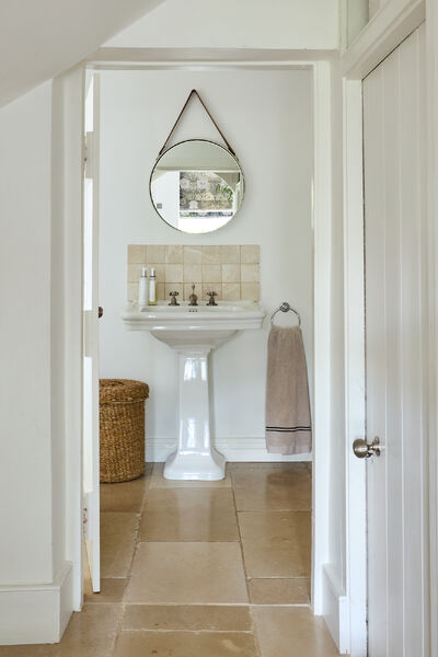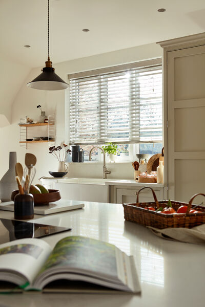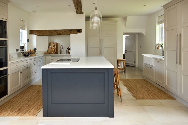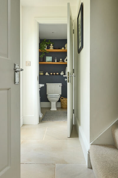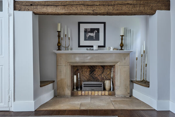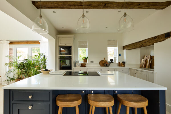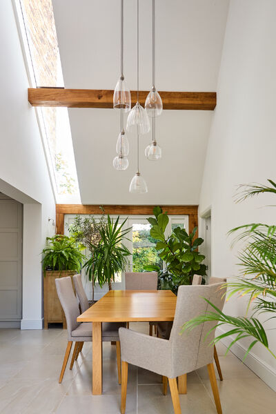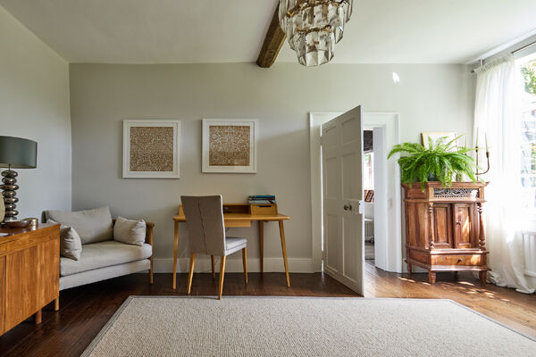 From the landing, you enter the study, which features an original inglenook fireplace and wooden floorboards. The study flows into the recently extended kitchen/dining room, with natural stone floor, which is equipped with a fully fitted kitchen and a central island with a hob. The new extension is characterised by a vaulted 6-meter ceiling with a partially glass roof, allowing ample natural light. Two sets of large French windows on opposite sides provide easy access from the driveway and the side garden.
