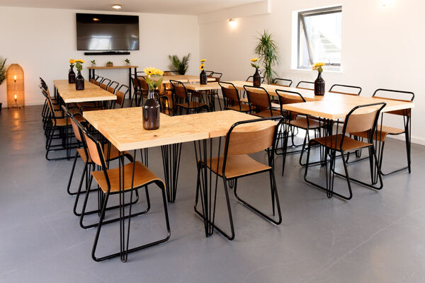 The meeting room is equipped with a 75” screen and speaker system.
