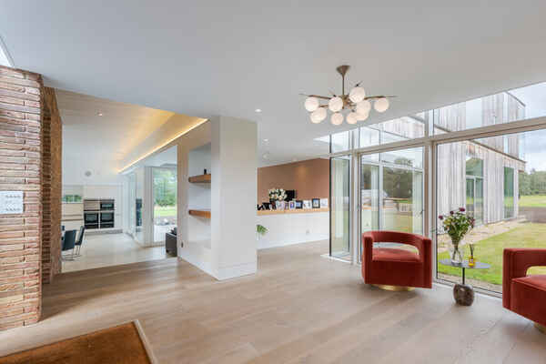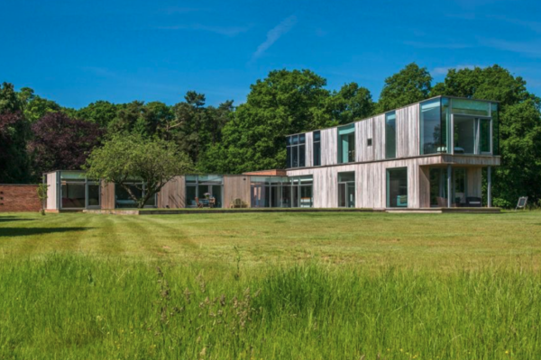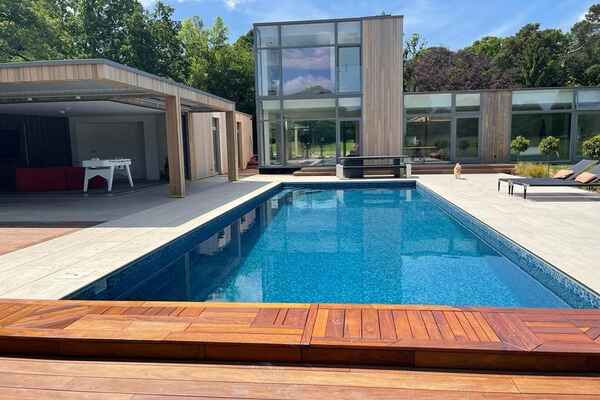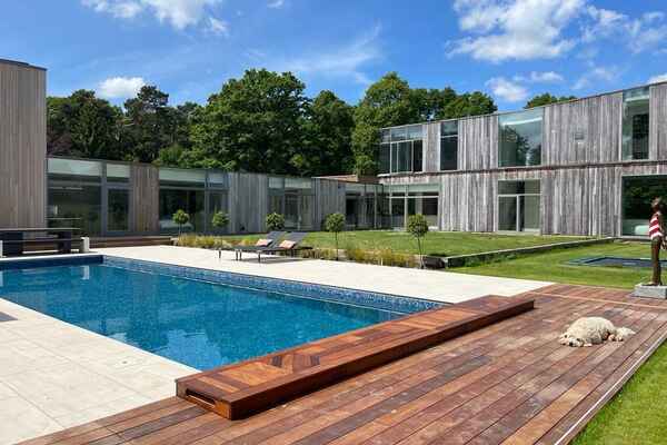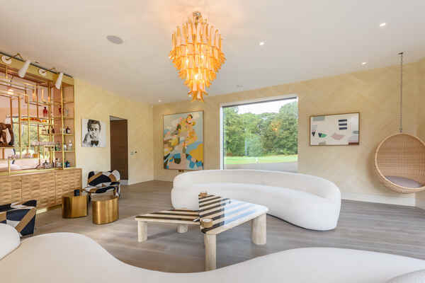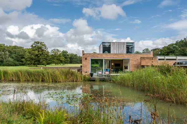 It has an open plan kitchen overlooking a huge pond and large modern firepit with seating zone.