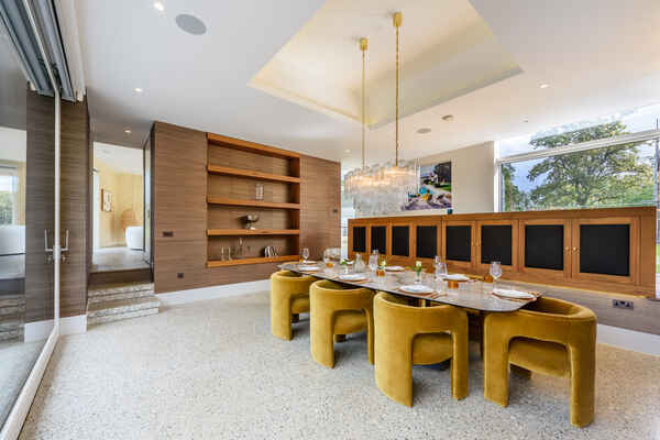 There is a snug television area flowing into the dining room and then the stunning formal drawing room and bar.