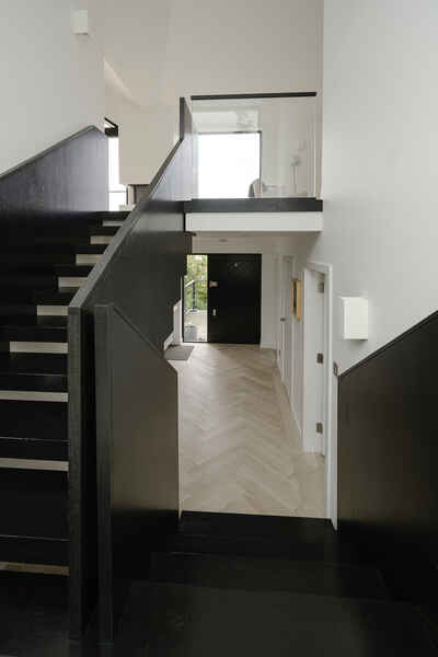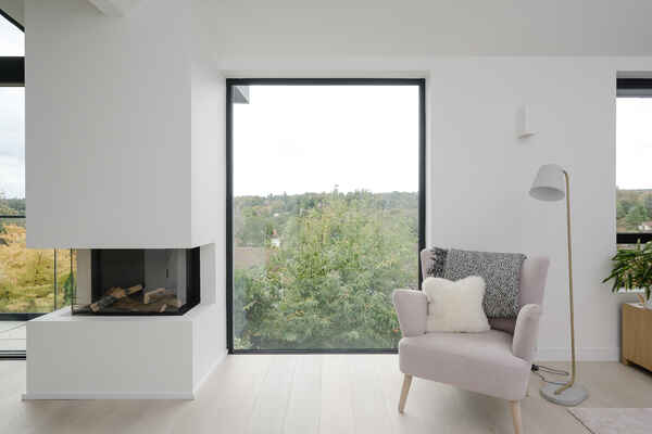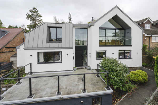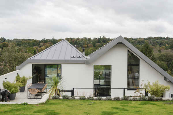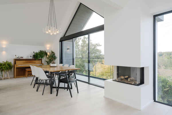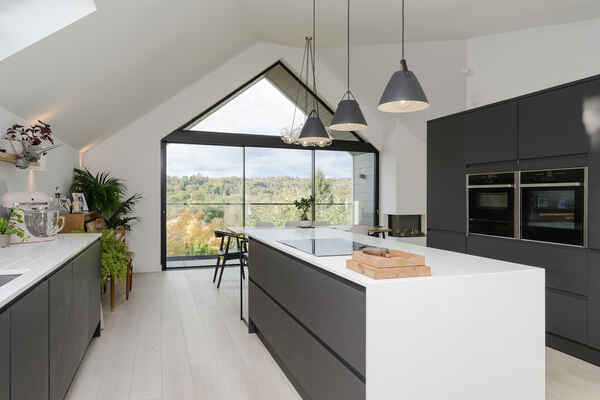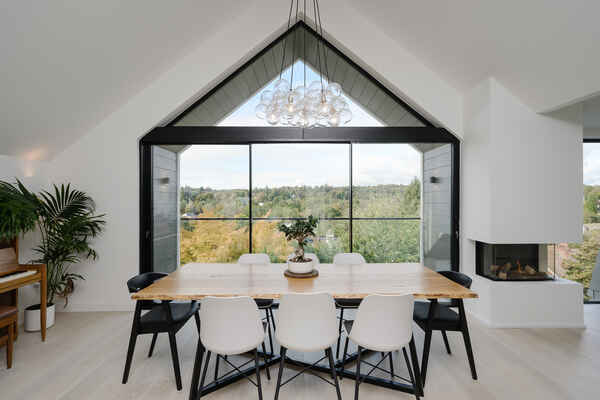 A contemporary architecturally designed house with floor to ceiling windows overlooking forest views.