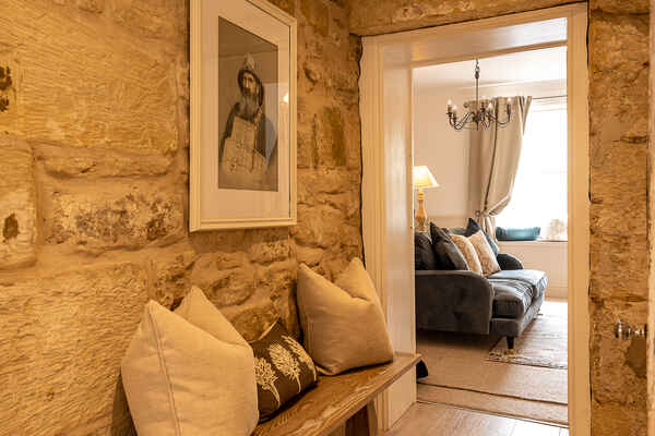 - Exposed stone walls
