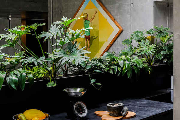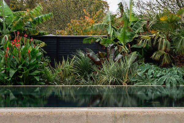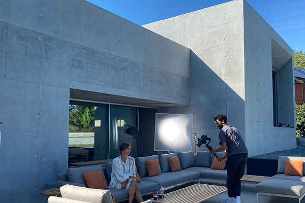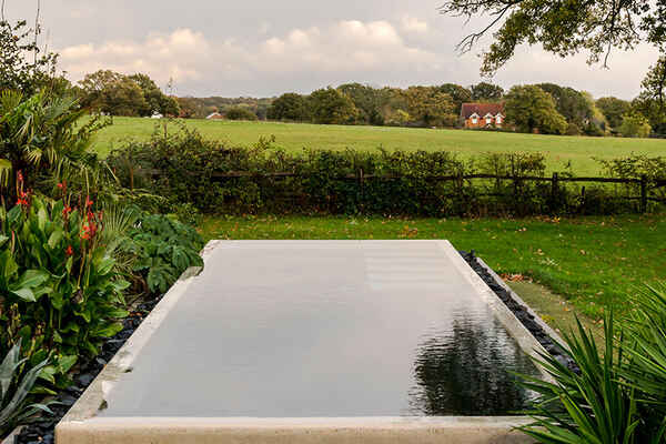 With views over the South Downs it has a modernist Palm Springs vibe, swimming pool, cool modern art, great textures, colour pops, large open plan kitchen and diner.