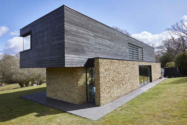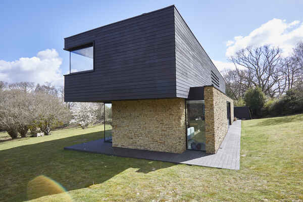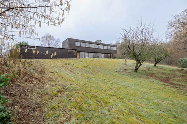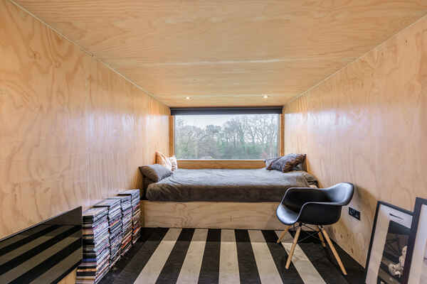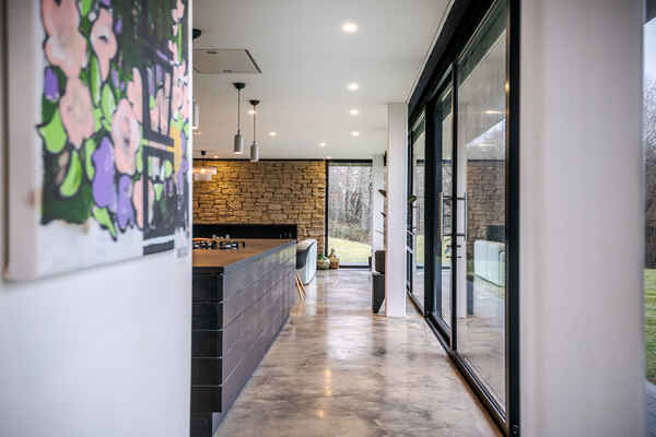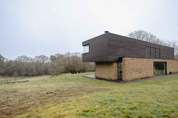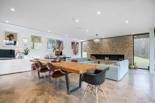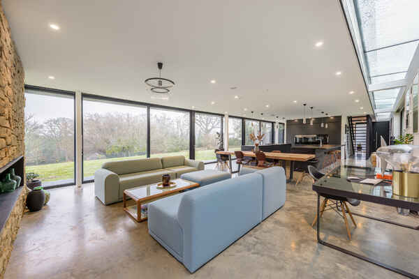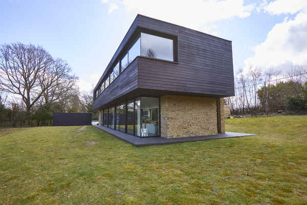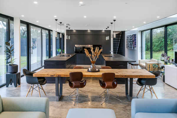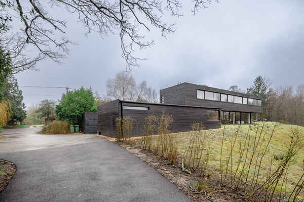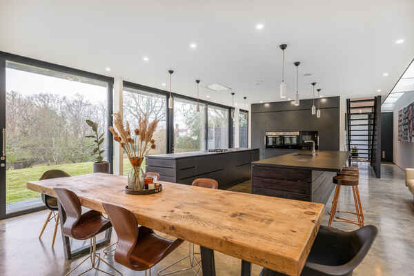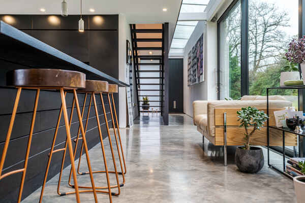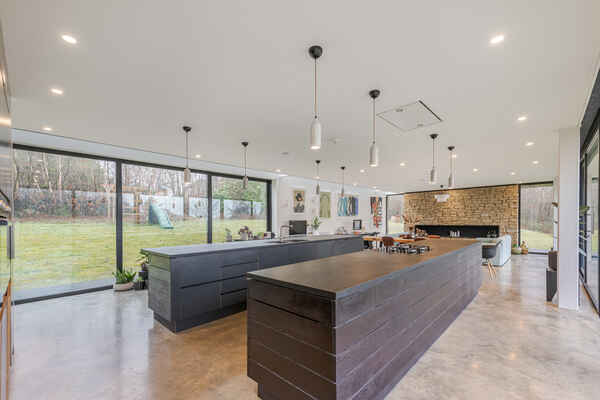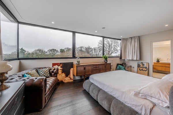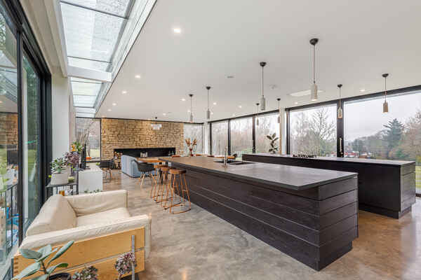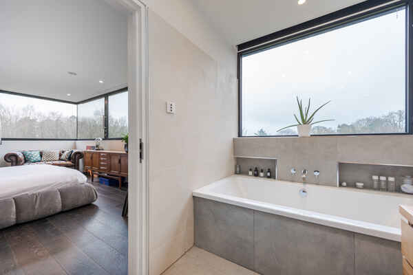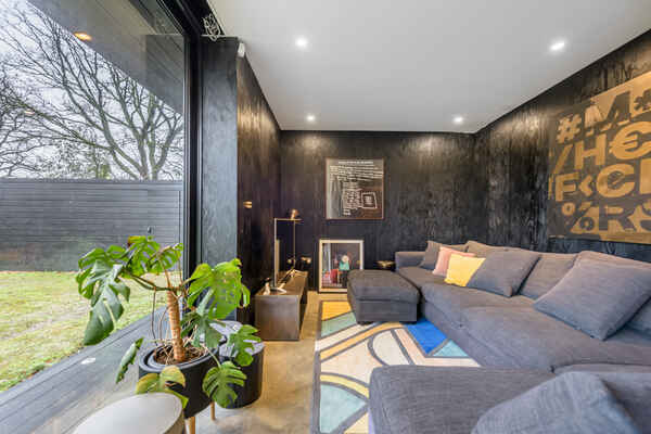 It is a Grand Designs new build with wrap around windows and black timber clad exterior. The kitchen has a stunning concrete floor with black timber kitchen islands. It has four bedrooms, two bathrooms, one shower, TV area and a detached cabin with a double bed looking over the countryside.