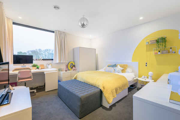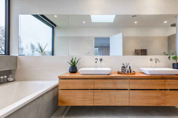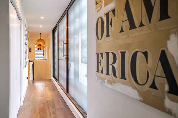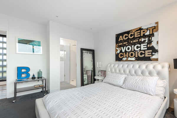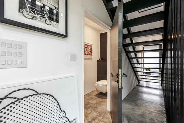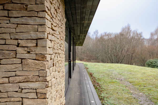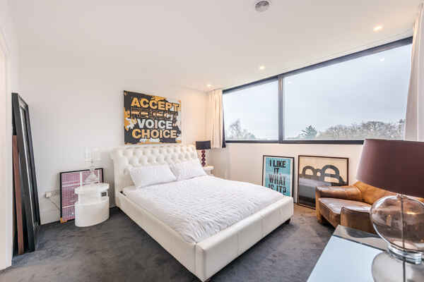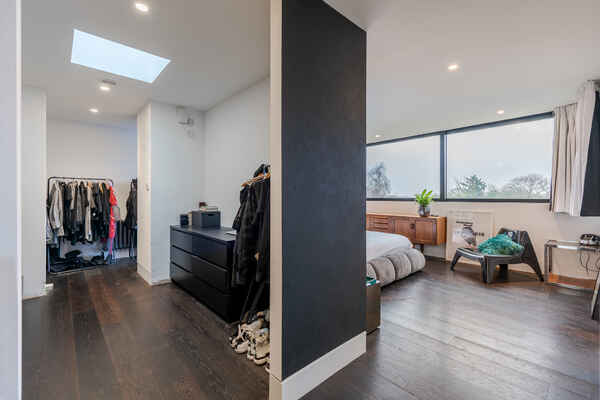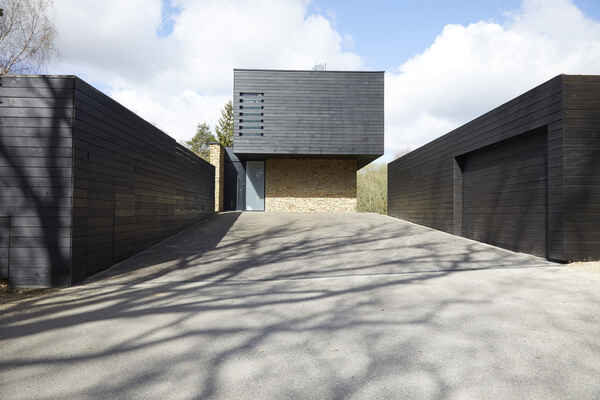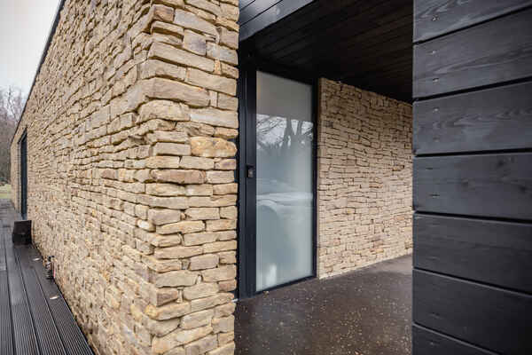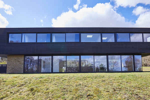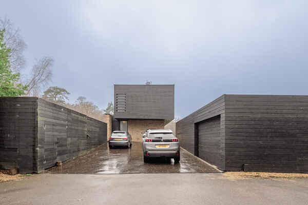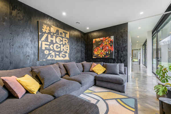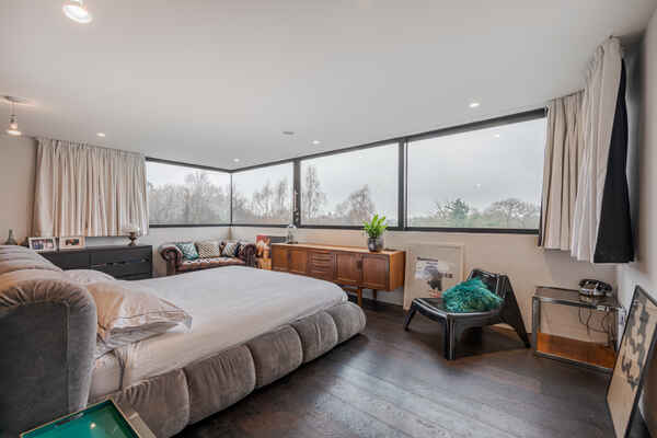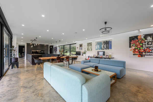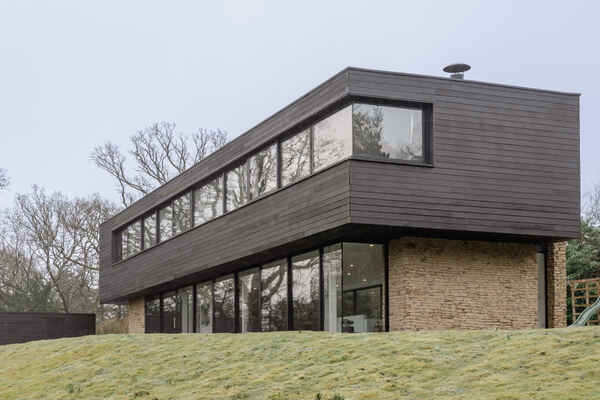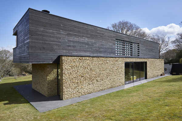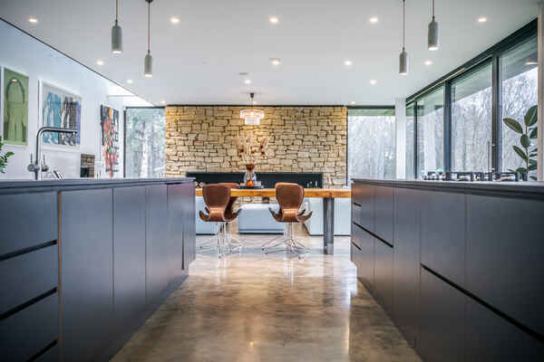 It is a Grand Designs new build with wrap around windows and black timber clad exterior. The kitchen has a stunning concrete floor with black timber kitchen islands. It has four bedrooms, two bathrooms, one shower, TV area and a detached cabin with a double bed looking over the countryside.