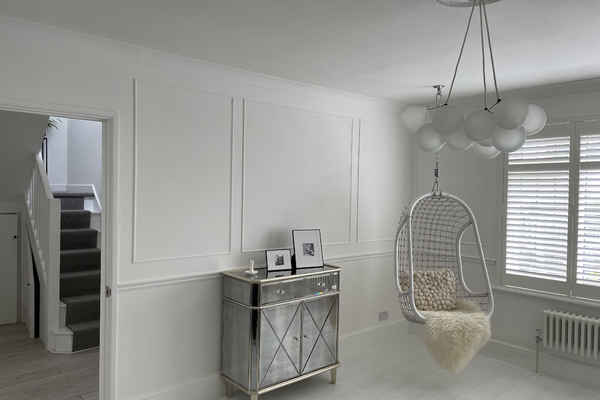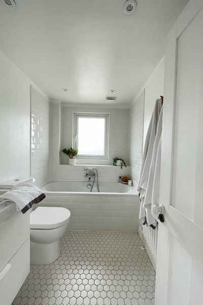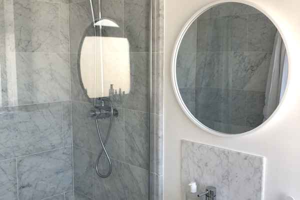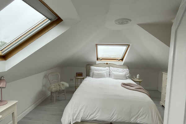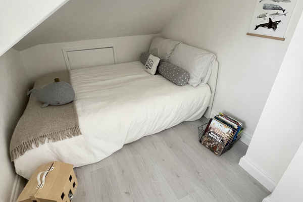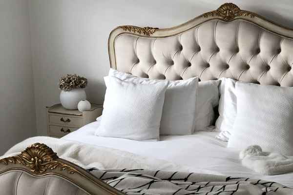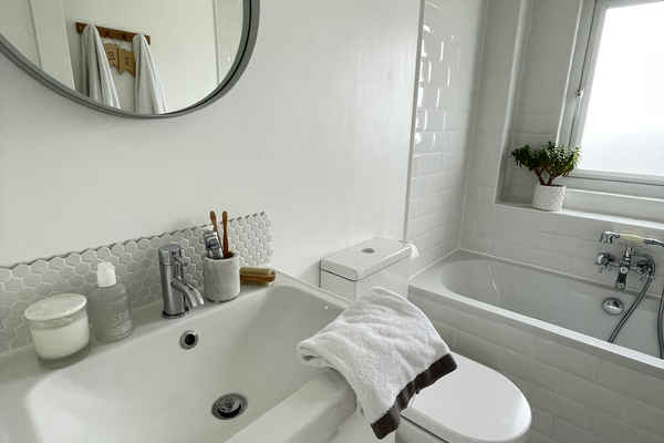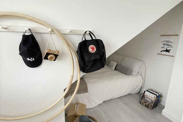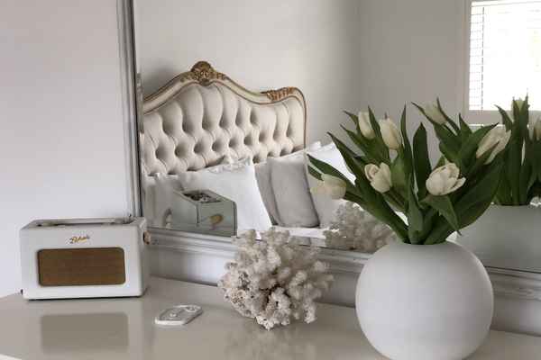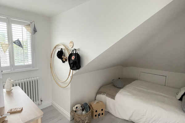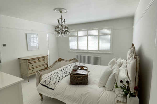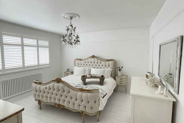 The bedrooms decorated in a mix of french and minimal styles and the bathroom is neutral and modern.