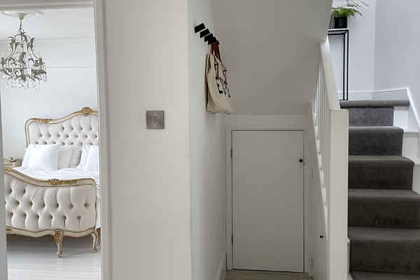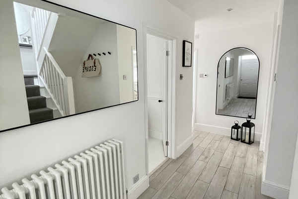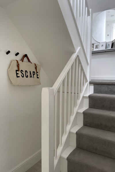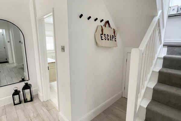 The hallway/staircase is spacious and leads upstairs to bedrooms with sea views.