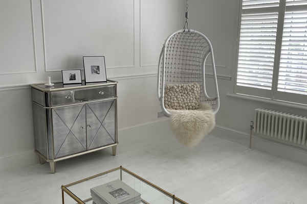 The kitchen is open plan and features a large dining area, a minimal spacious lounge featuring a beautiful hanging chair.