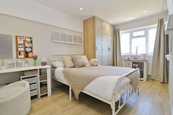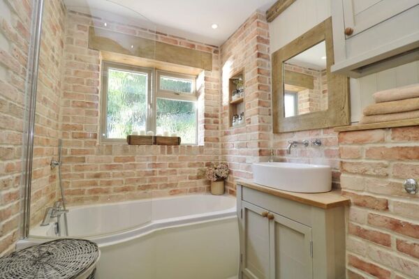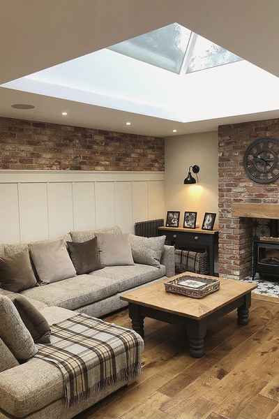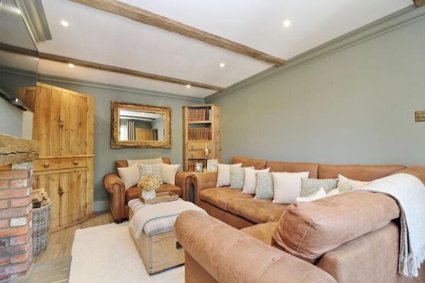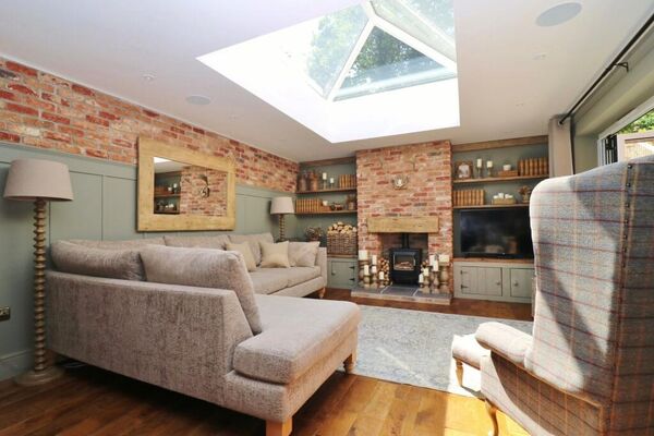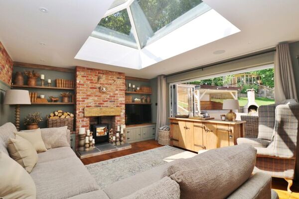 The cosy living space features exposed brick fireplace with working log burner and sky light bringing in plenty of day light.