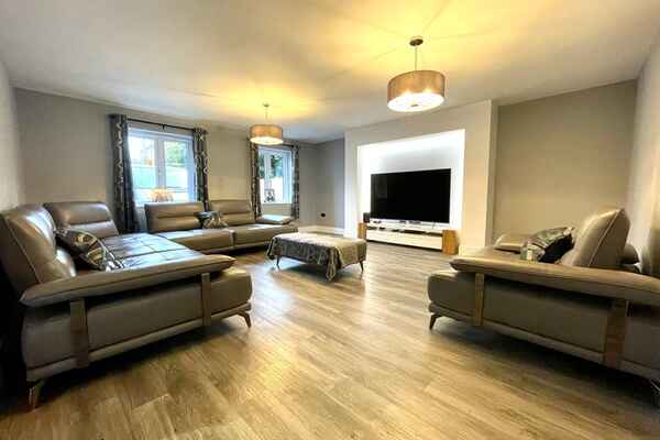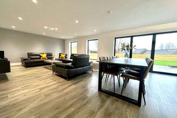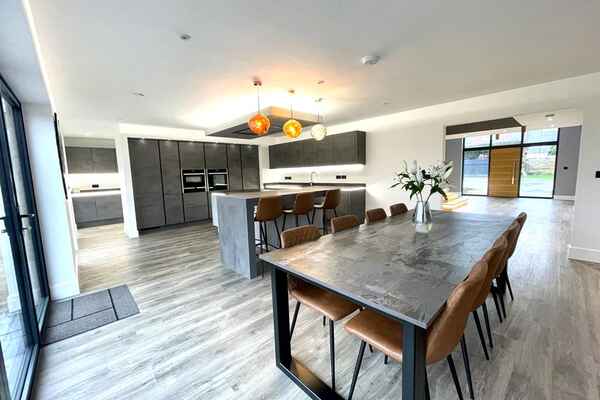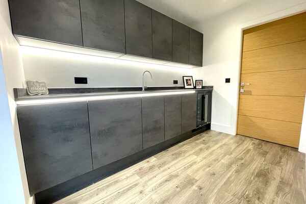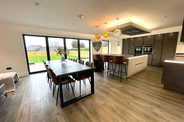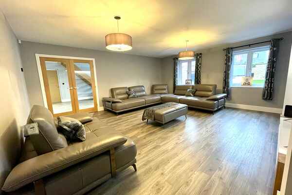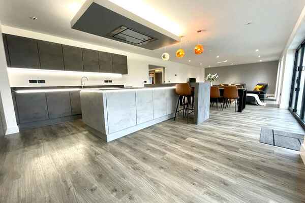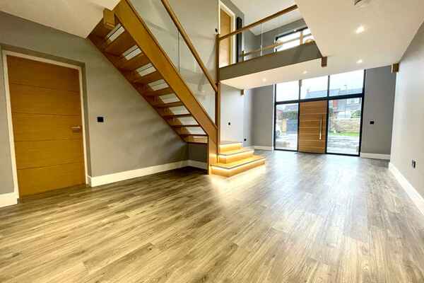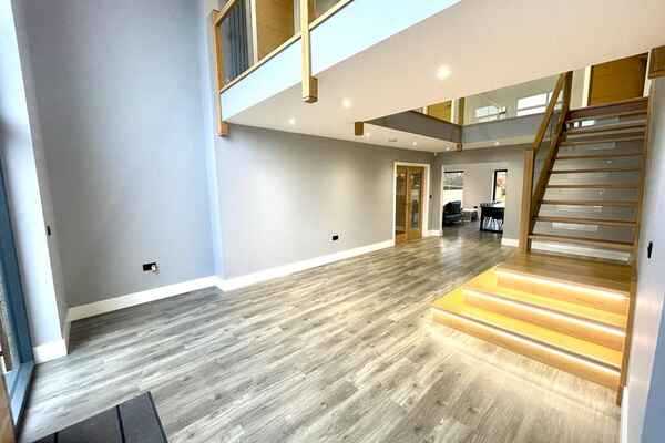 Upon entrance is a large hallway with double height window front. There is amtico deposit flooring flows through-out the ground floor into an open plan german kitchen , dining and living area.