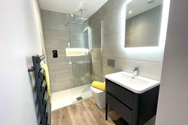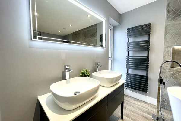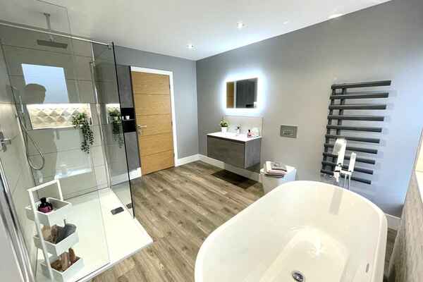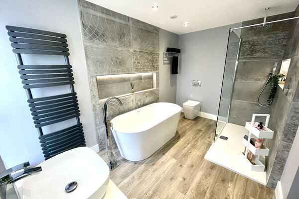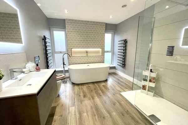 The main family bathroom is modern in style with feature lighting.