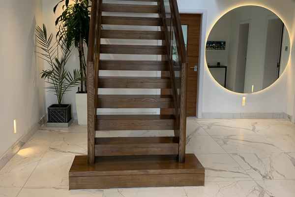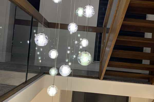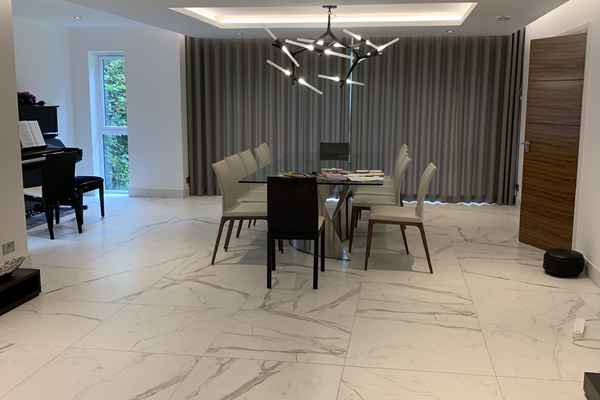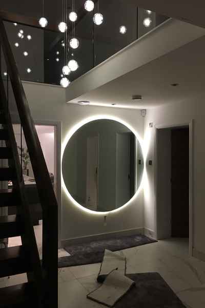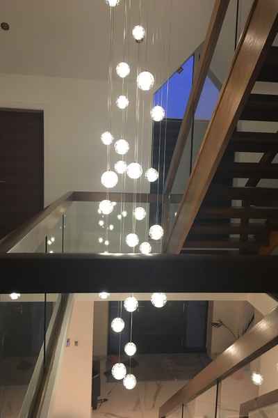 The entrance is large with a central staircase, marble flooring and featured hanging lights.