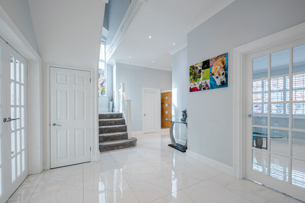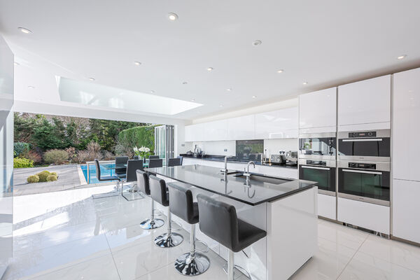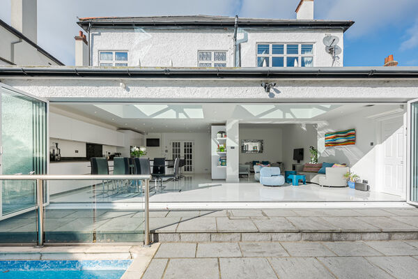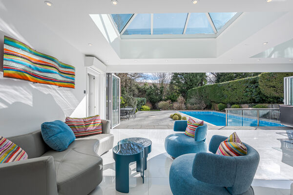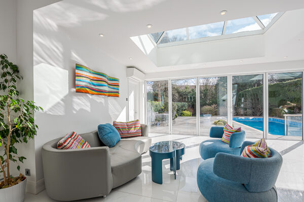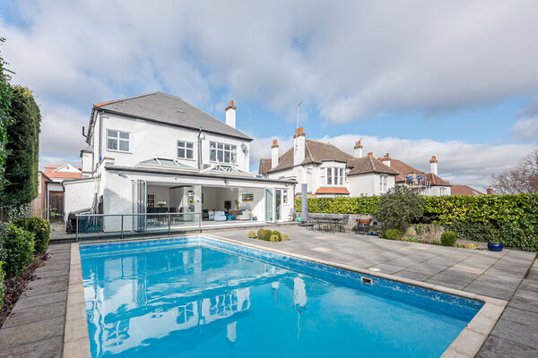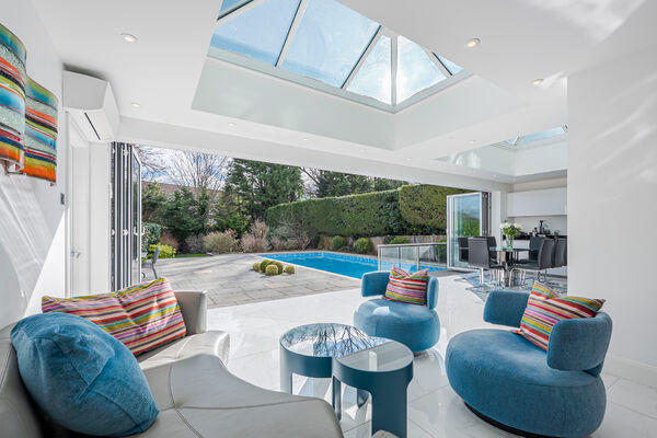 This light and airy open plan home has high ceilings, marble flooring and an outdoor swimming pool as focal features.