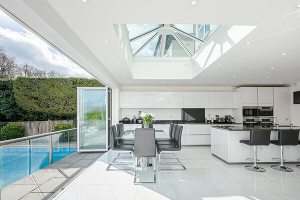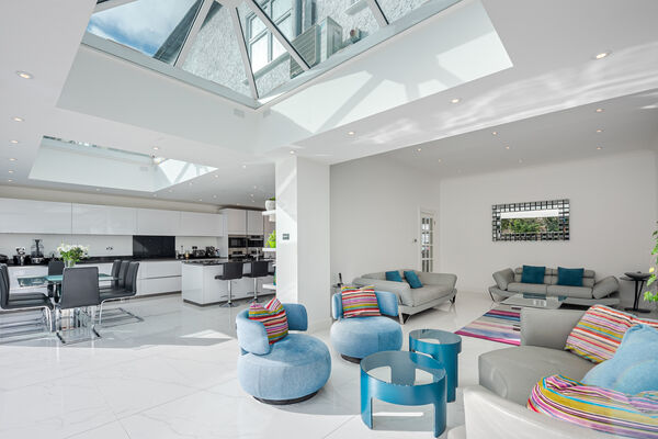 There is a open plan kitchen, dining and reception area.