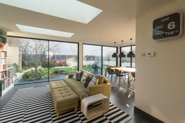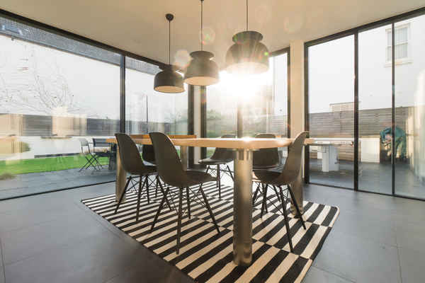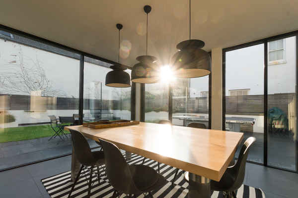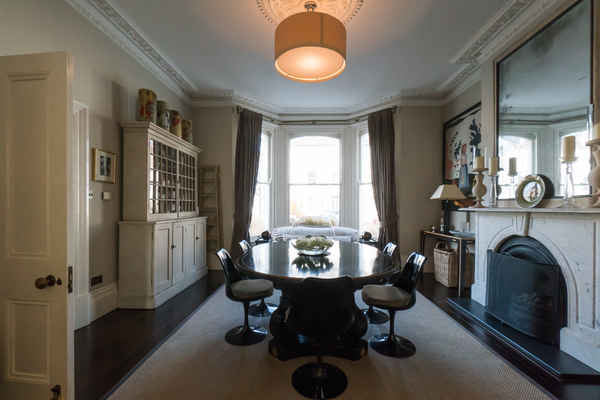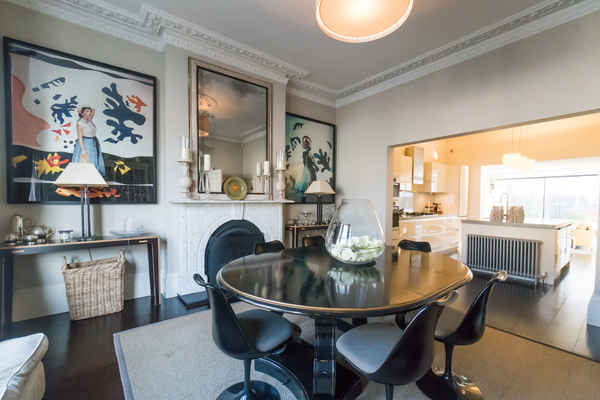 On the ground floor there is an open plan dining room leading to a modern kitchen and glass extension which opens up to the garden.