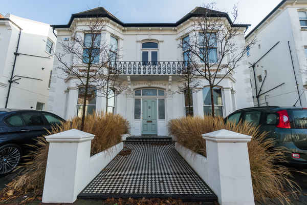 Large detached Victorian Villa on a wide tree lined street with views down to the sea. Abundant grasses soften the front aspect of the house.