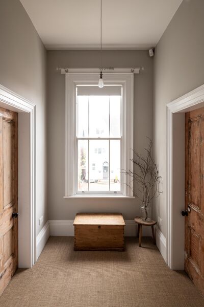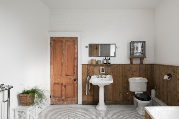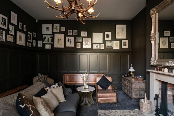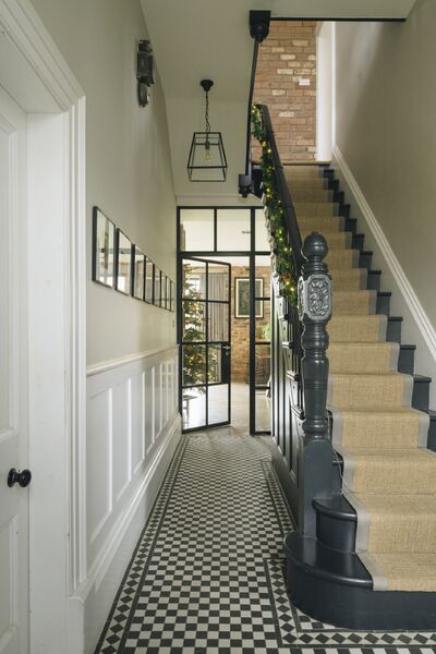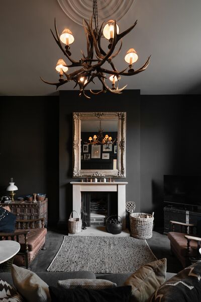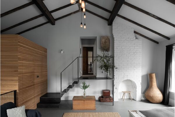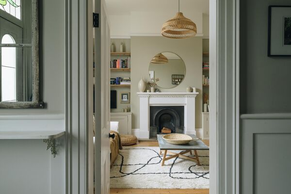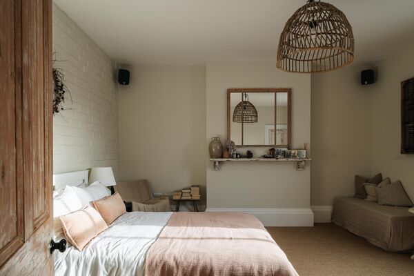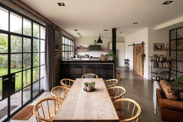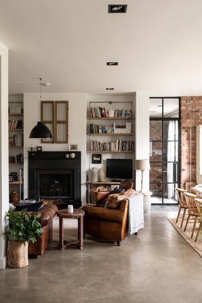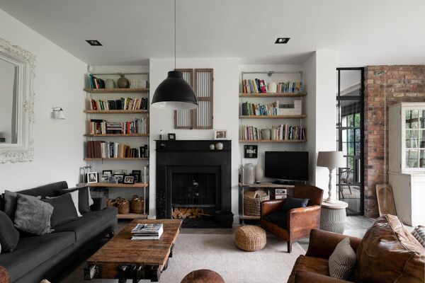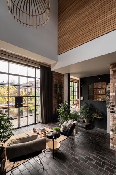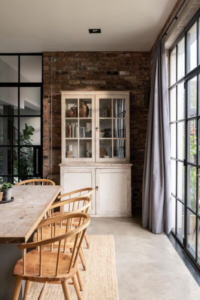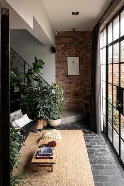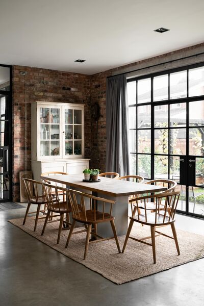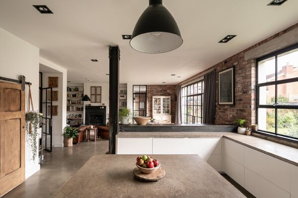 A modernised period property with an open living space, high ceilings and exposed brick walls.