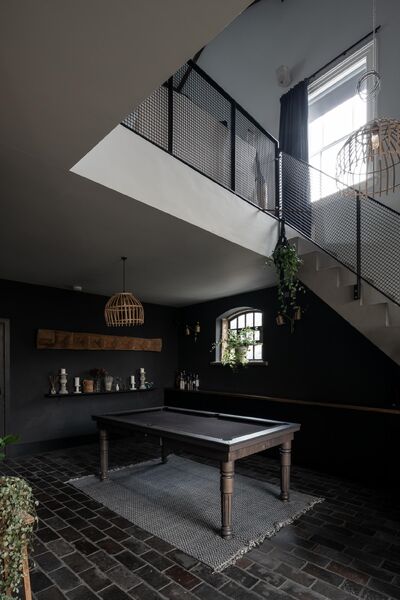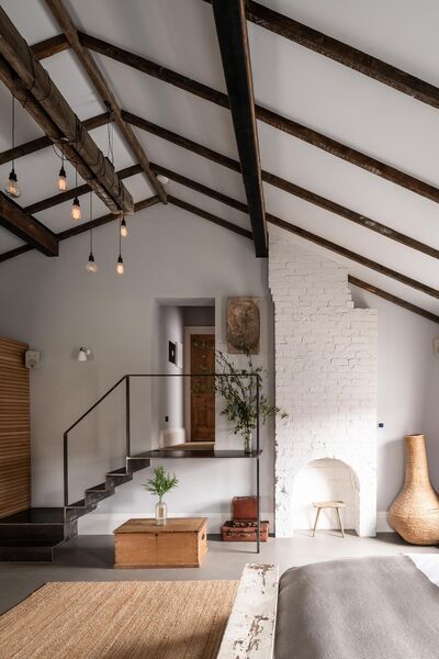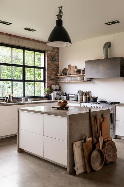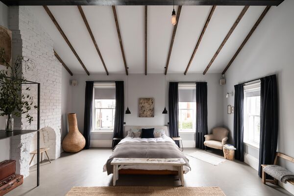 The property is full of original details dating back to its Victorian era which have also been complimented by several industrial touches. Many of the rooms have exposed brick and wooden panelled walls. There are steel columns and fireplaces, concrete floors and worktops, and blue brick floors. All ceilings are 10 ft tall which give a real feeling of space and light. At the rear of the property there is a double height area which also has a balcony overlooking it. The master bedroom has a huge, vaulted ceiling with exposed beams and contains the mezzanine balcony.