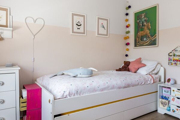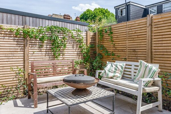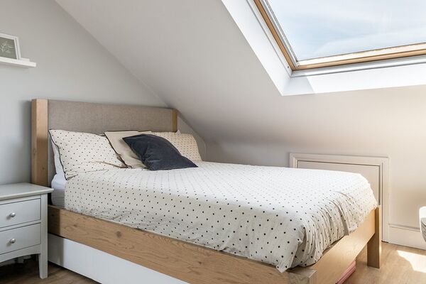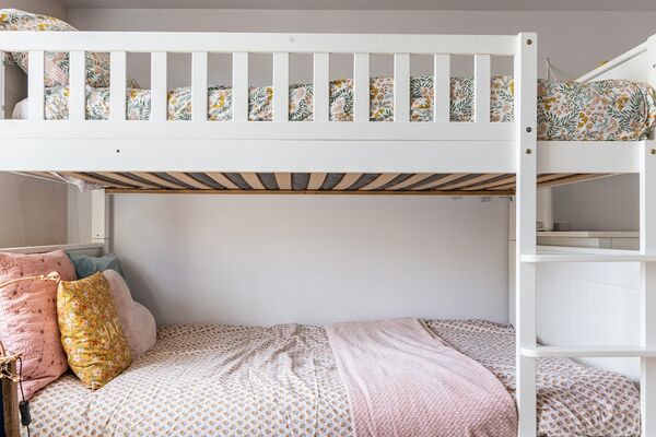 The setting includes a separate kitchen with skylight and bifold doors, as well as a cosy yet lively living space. There is a freestanding bath in the bathroom. There are five bedrooms, two of which are for kids, and they are all neutrally done. A beautiful garden area with a patio.