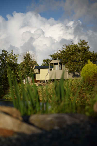 Five hand crafted traditional huts in North Wales over looking a wild flower meadow and private lake.