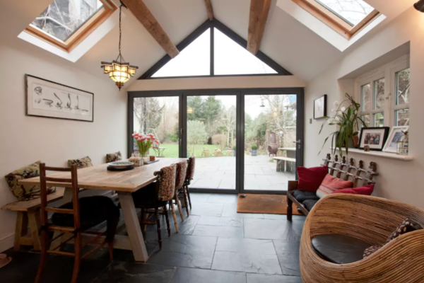 It includes a large kitchen diner and 2 lounges. The kitchen has seating for 10 round the table and there is a bifold door which opens up onto the patio.