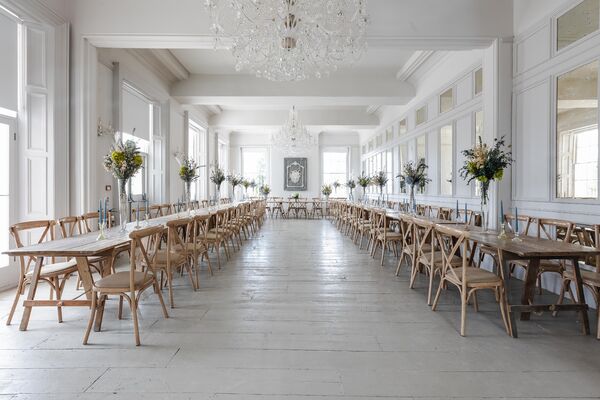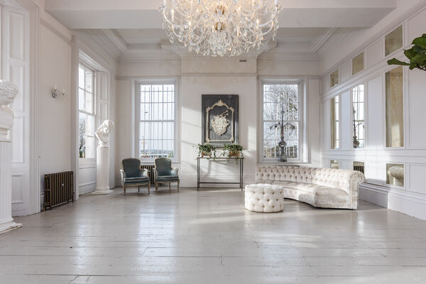 Wonderland, our triple-aspect grand ballroom. The natural light in Wonderland is enhanced by two spectacular chandeliers and a wall of panelled antique mirrors running the length of