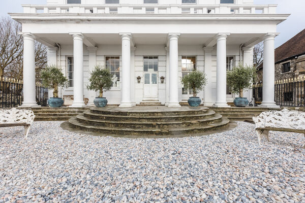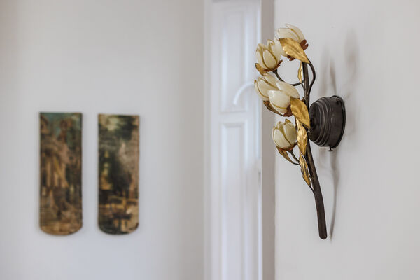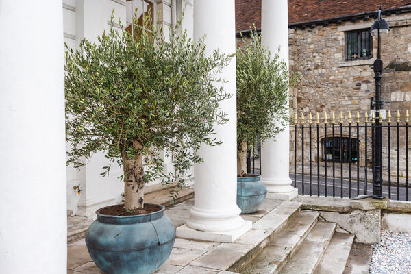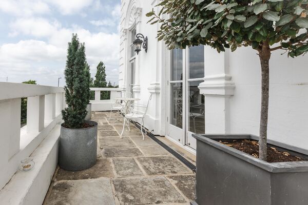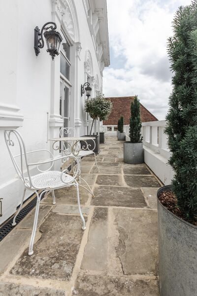 the room. Outside on the original stone terrace, from amongst old olive trees you have a view of the Royal Pier. If you venture back into the hall and up the grand winding staircase, there