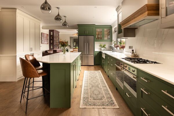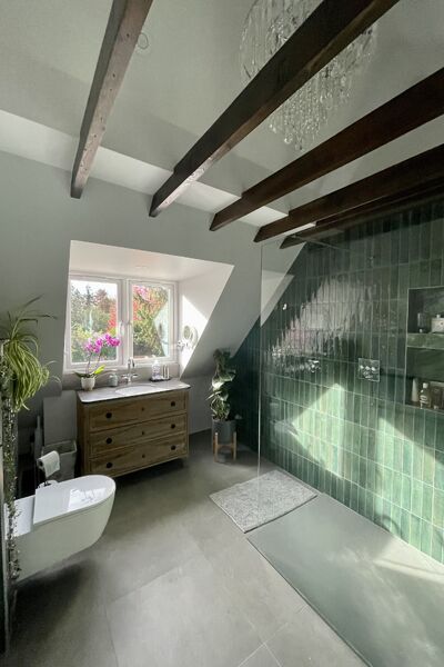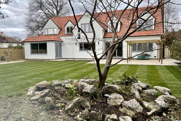 This modern, recently renovated home boasts clean lines and stylish finishes, making it an ideal location for photo shoots. From its beautiful covered porch and striking green door to the front stone cladding and grey resin driveway, the exterior exudes contemporary charm with a touch of warmth from the red roof and white render finish.