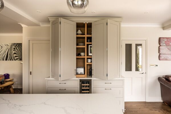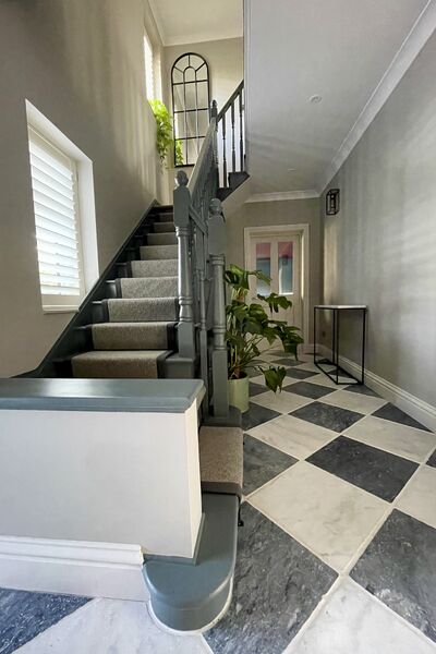 Inside, the property features four bedrooms, including fun and vibrant children's rooms, along with a vaulted ceiling en suite for added luxury. The open-plan living area is highlighted by black and white tiles in the hallway, while the lounge offers a dramatic contrast with dark paint, including an aubergine ceiling and navy walls, creating a sophisticated yet cozy atmosphere.