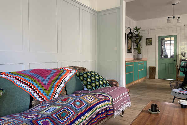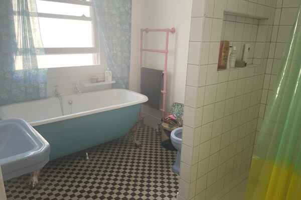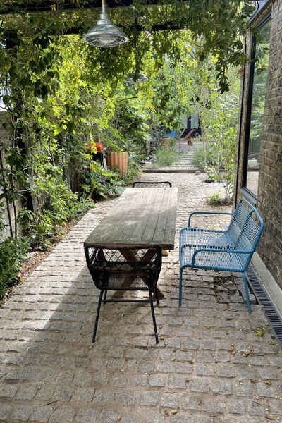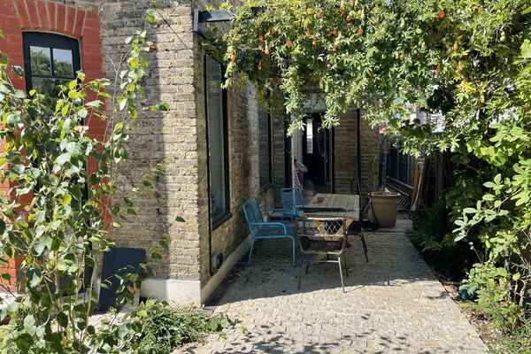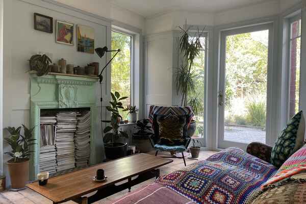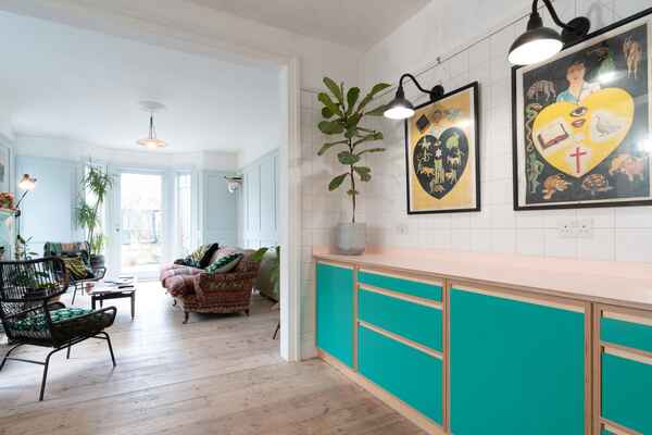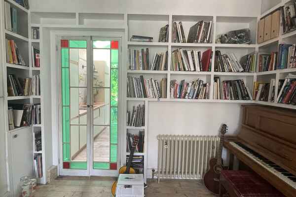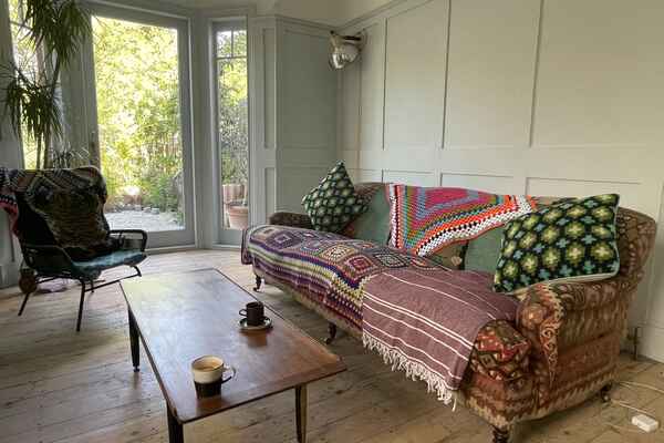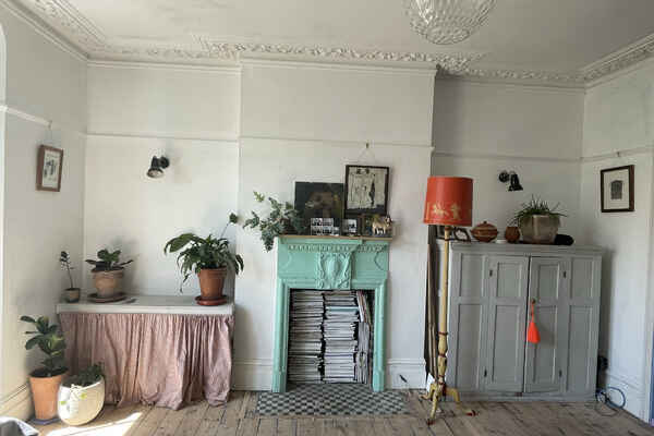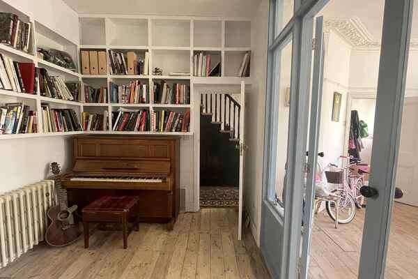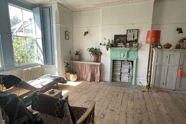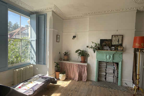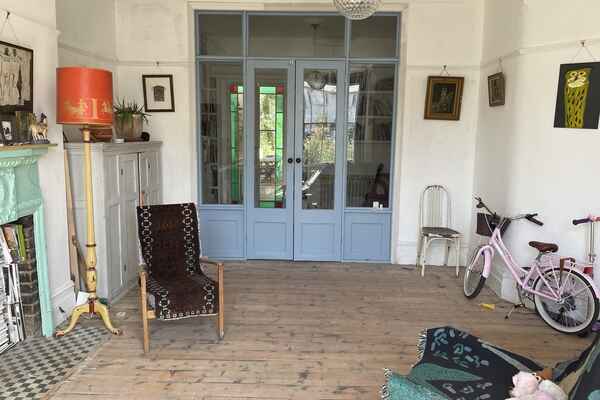 The house has been newly refurbished downstairs. The front room is a large bright reception room with wooden sash windows and handmade solid shutters. The three reception rooms down stairs have reclaimed fireplaces from an asylum. They have a fantastic thick lead 1960s original paint finish although the fireplaces are from the 19th century. There is a little library room with a piano and stained glass original door. The kitchen is a modern plywood kitchen with bright green cupboards. The garden is large and mature with giant grasses, silver birch and a huge plum tree, it has a beautiful cobbled area and a small studio at the bottom of the garden. Upstairs there are three bedrooms that are in the process of being renovated so anything can be done to them! There is also a bathroom with a 19th century free standing bath.