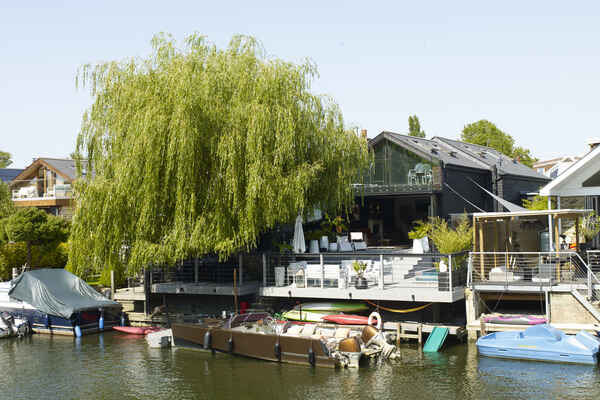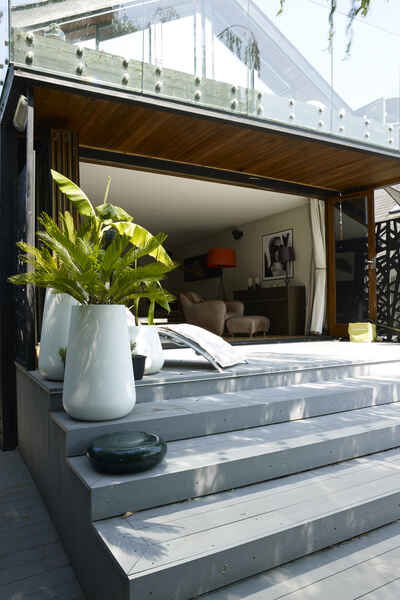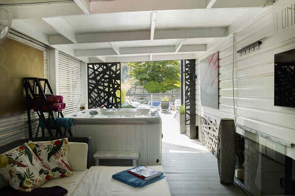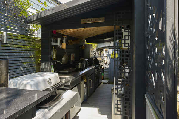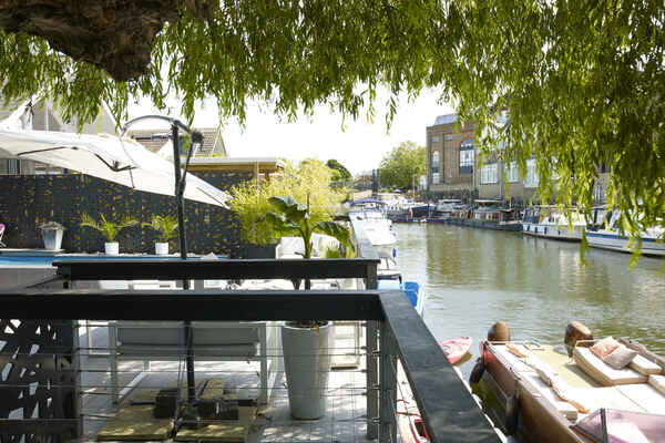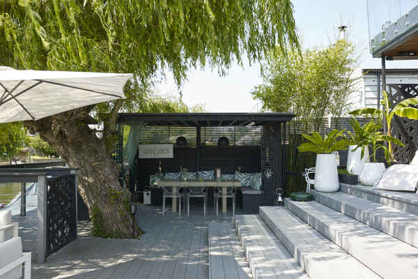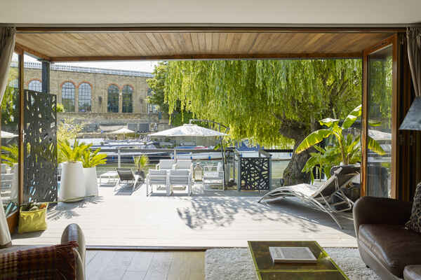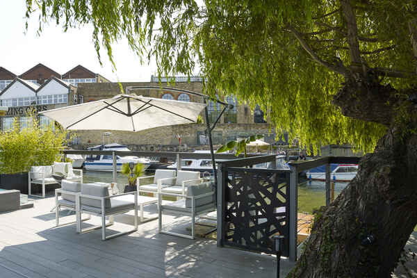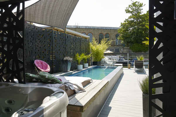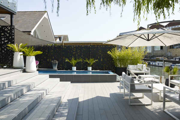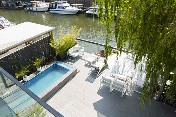 Outside is an outdoor bar, kitchen, loungers, seating areas, outdoor shower, spa and splashpool looking onto the River Thames, with balcony for elevated views. By night the garden transforms with LED lights.