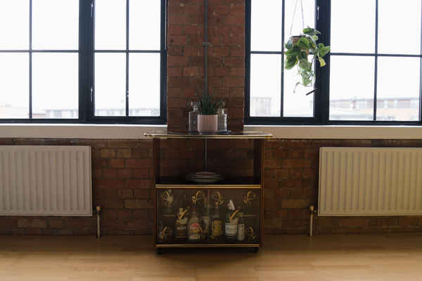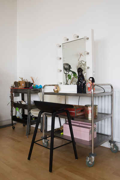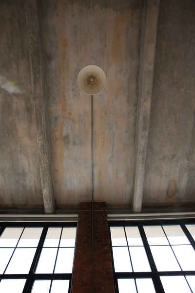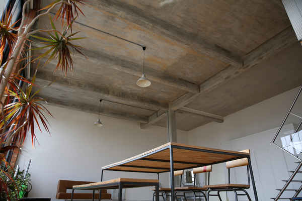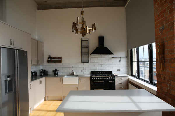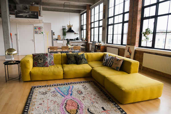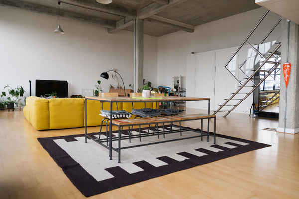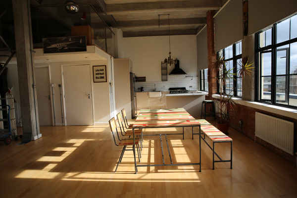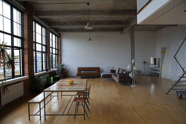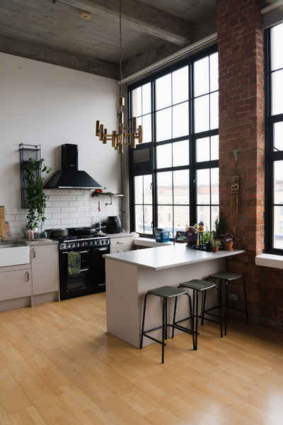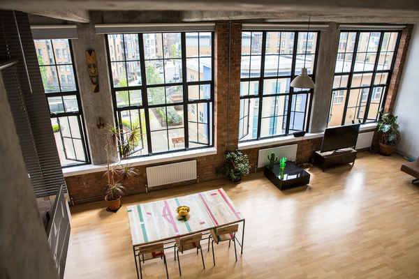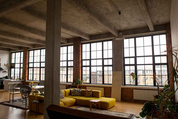 This industrial open plan studio apartment is flooded with natural light with large windows and high ceilings.