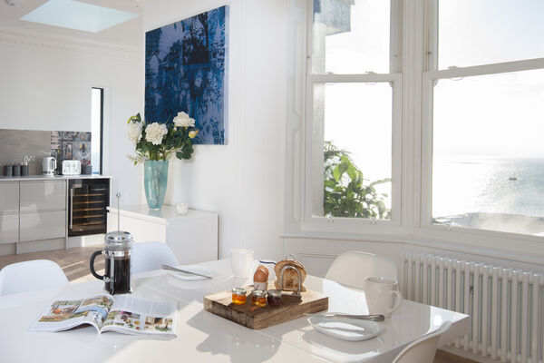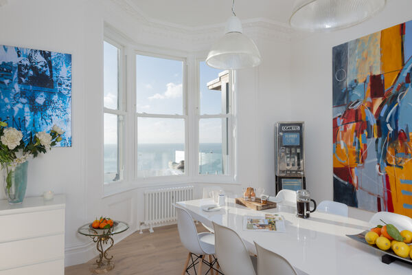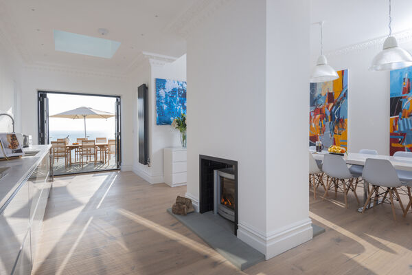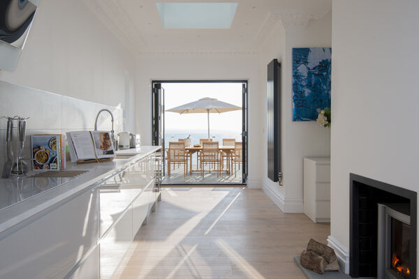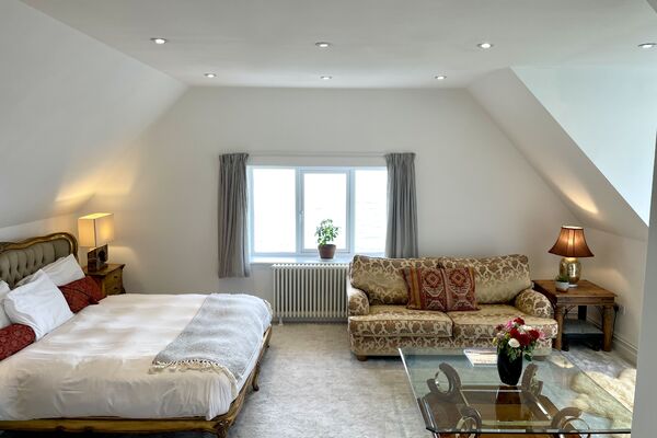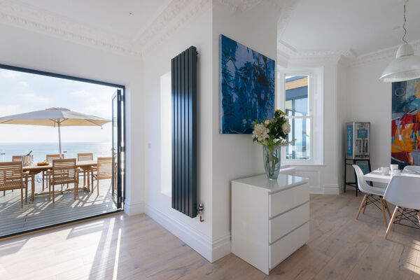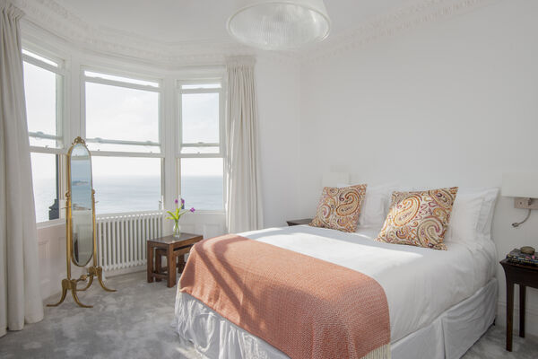 On the top floor, a huge superking double aspect room has glass sliding doors opening onto a roof terrace overlooking the sea.