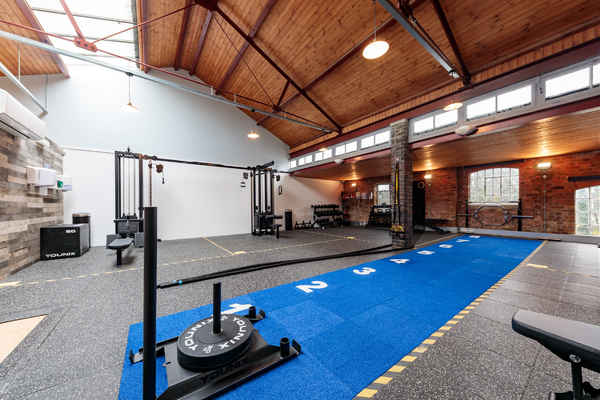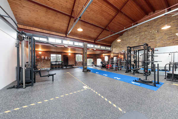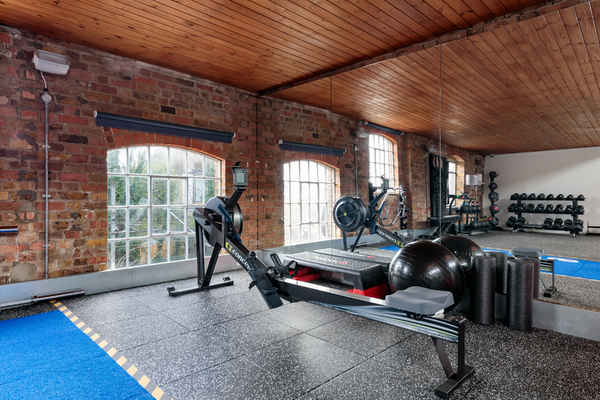 This open plan gym space situated in a loft is finished to a high standard with both exposed brickwork and white walls and plenty of high quality fitness equipment.