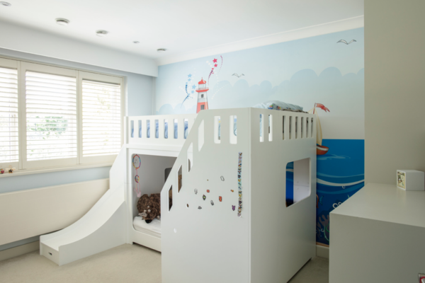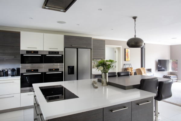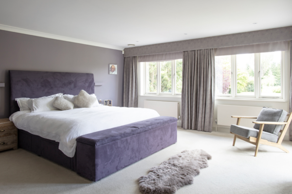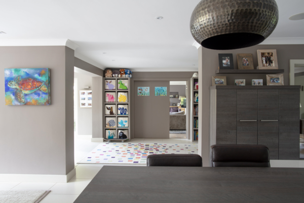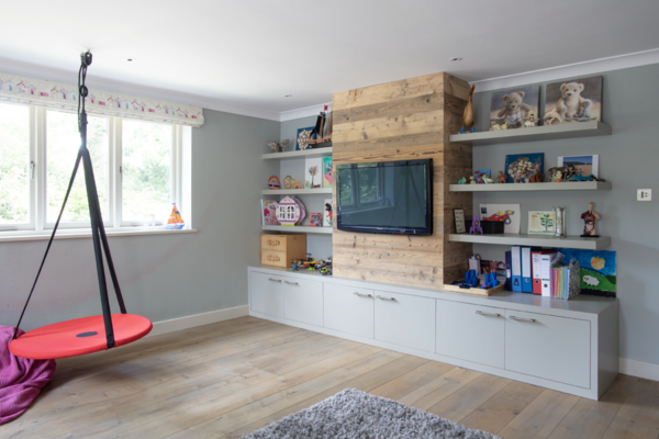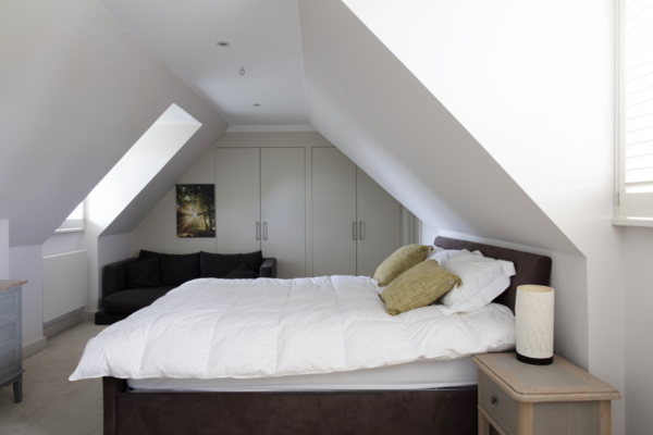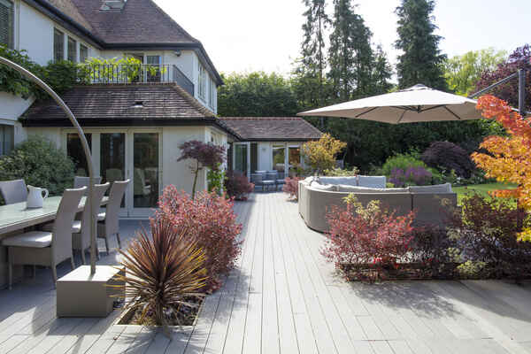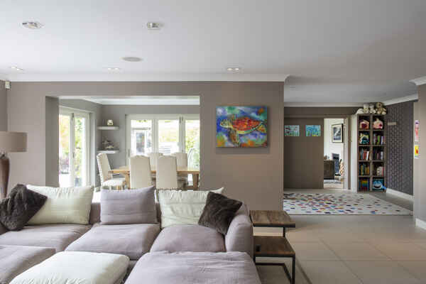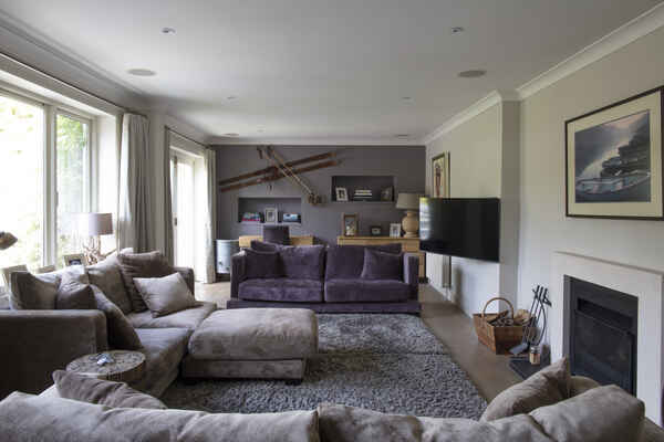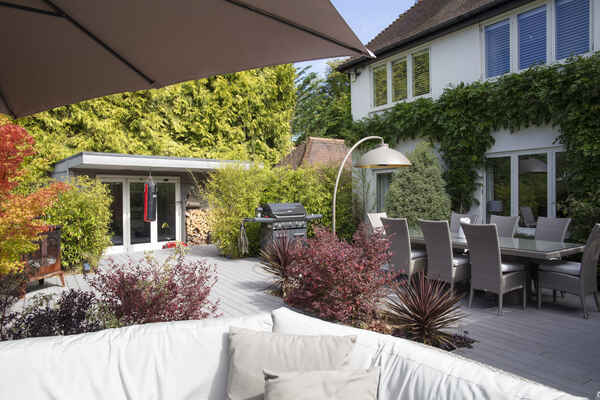 The enviable kitchen/breakfast/family room opens via huge wooden bifold doors to a 250 square metre decked area with recessed planting, then onto a colourful south facing garden with views of trees and sky. The kitchen features modern soft-close cabinets in wood grain effect, quartz worktops and top-of-the-range integrated Miele appliances. The informal drawing room has a modern limestone fireplace complemented by wide planked timber flooring with recessed up-lit bookshelves leading onto the rear decking. The decking itself has a huge ‘c’ shaped sofa which seats 12 people comfortably and a dining table for 12.
