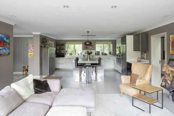 Designed for family living, this spacious 6 bedroom home incorporates high specification and finishes combined with wonderful views of big skies across a luscious, mature, succession planted garden with ‘secret’ children’s play area. The property is approximately 6,000 sq ft approached along a safe and quiet gated private road.
