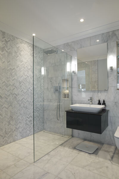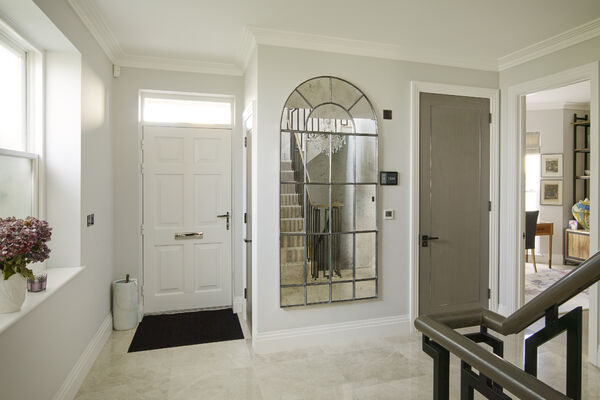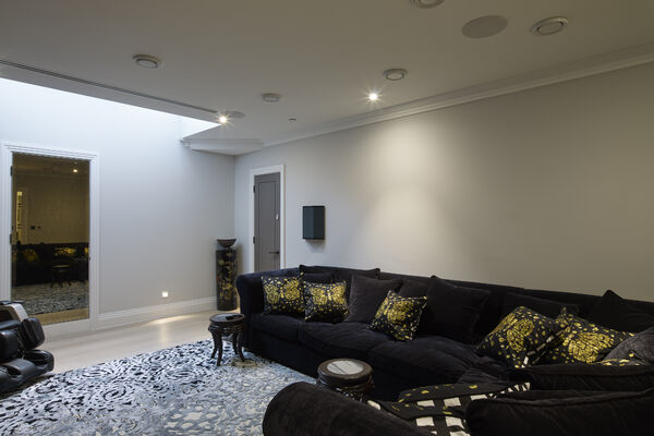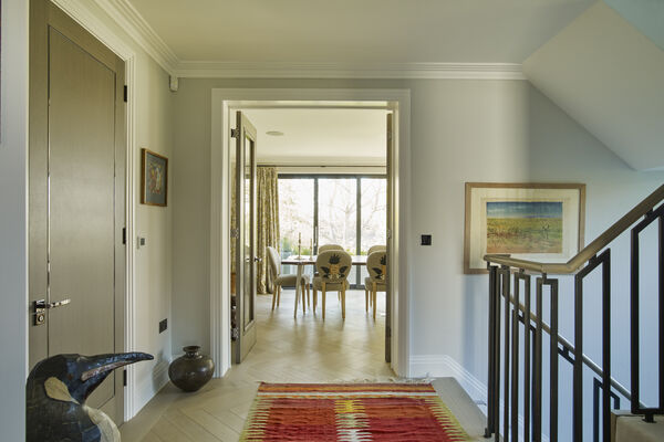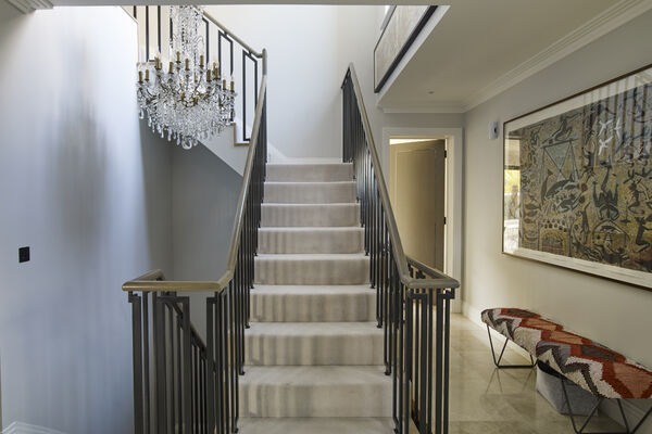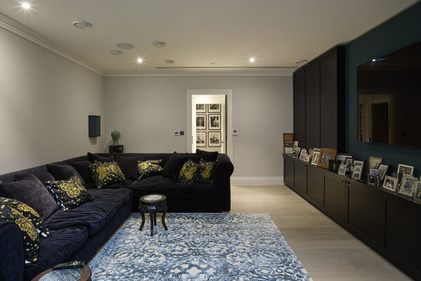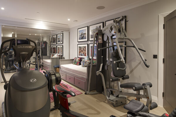 The generous living space includes 4 formal reception rooms, as well as a gym and tv den / cinema room, which leads onto a covered courtyard garden with a “walk on” glass ceiling. The enviable kitchen/breakfast family room opens onto a west backing walled garden and features modern linear handleless cabinets, quartz worktops and top-of-the-range integrated Miele appliances. The formal drawing room has a modern limestone fireplace complemented by timber flooring and inset carpet, leading onto an additional outside rear terrace.