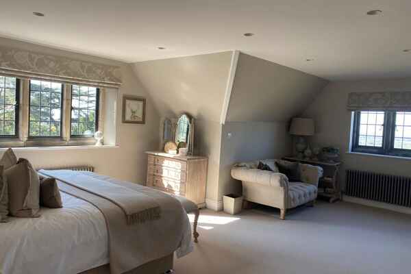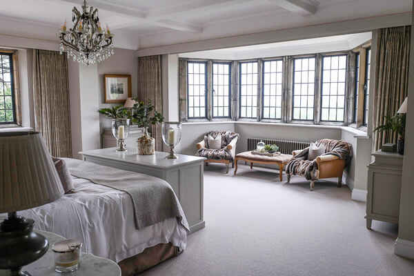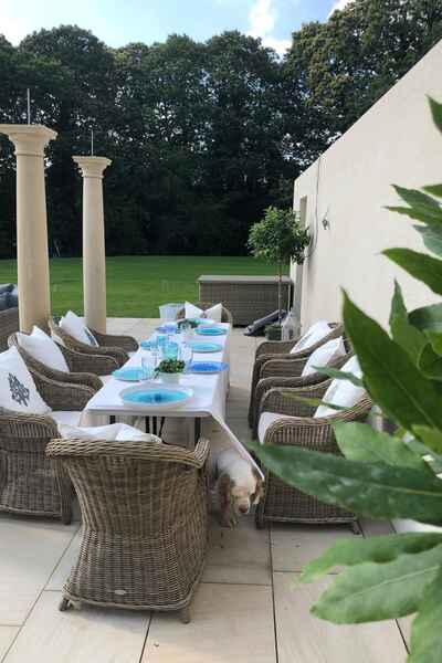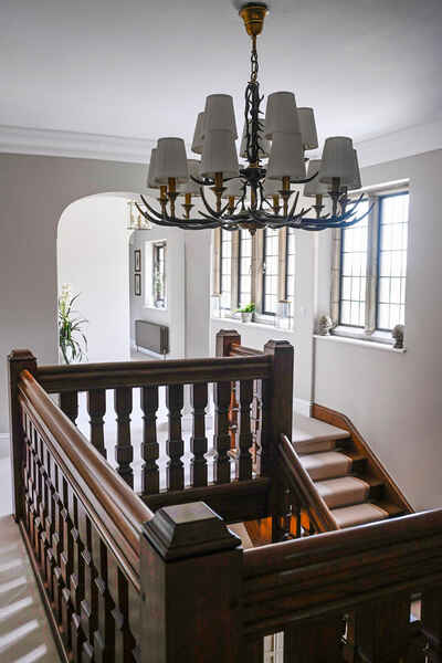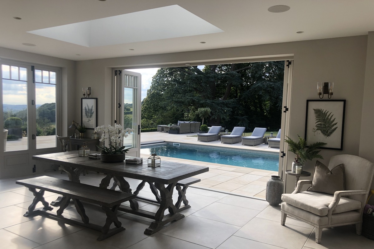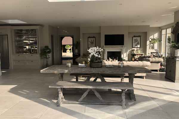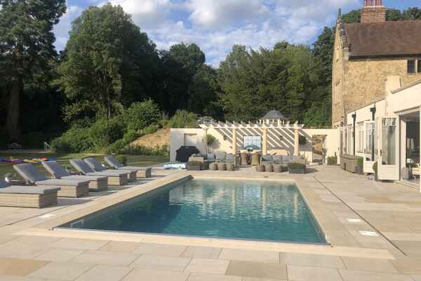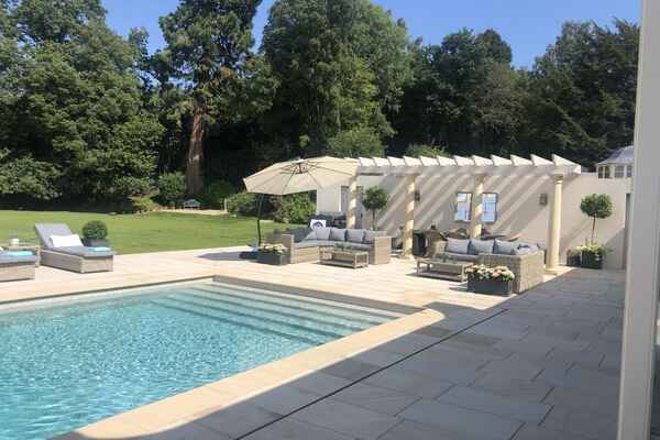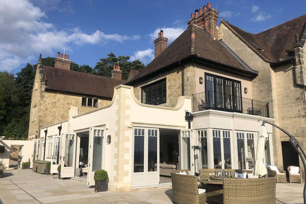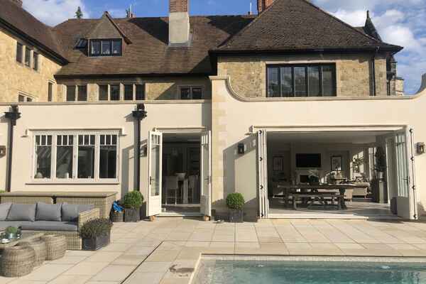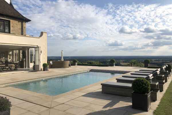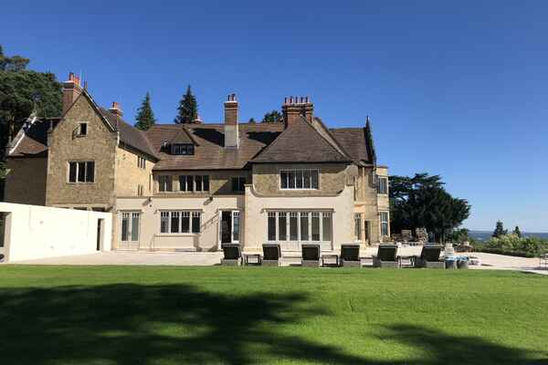 This home has an outdoor swimming pool, sloped garden and stunning views over the south downs. It has been meticulously renovated into a modern family home. It is incredibly spacious with an open plan kitchen, dining and sitting room overlooking the swimming pool and gardens. It has eight bedrooms, seven bathrooms, a cinema room, a basement dining room and a folly.