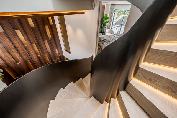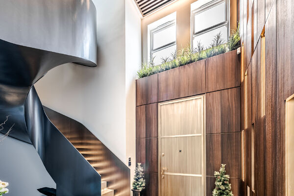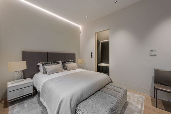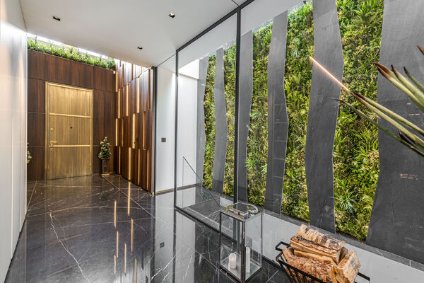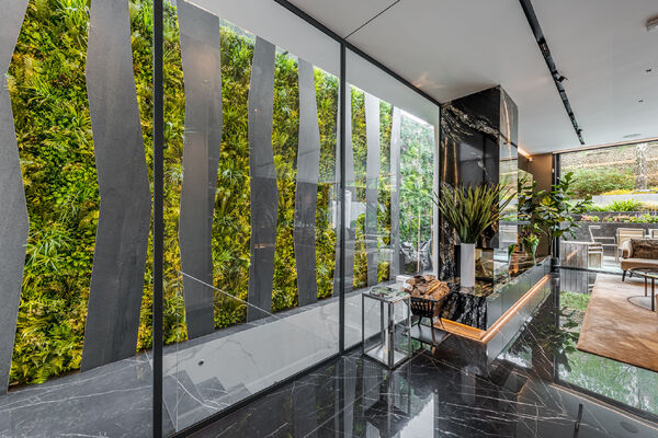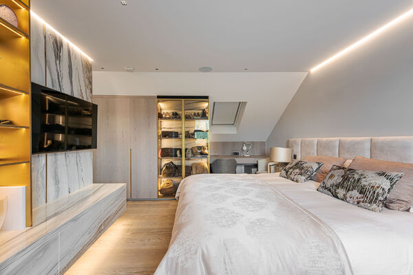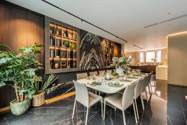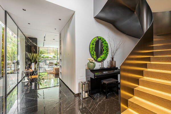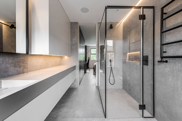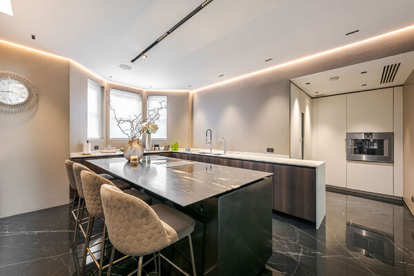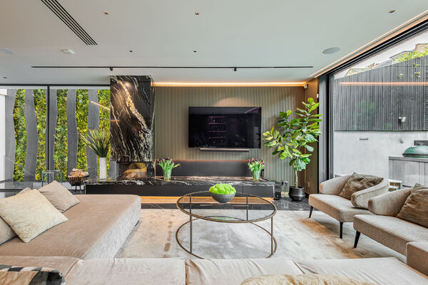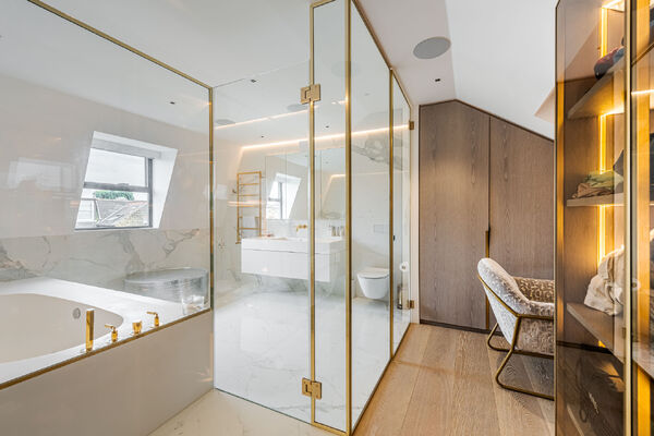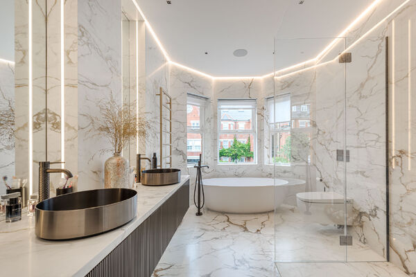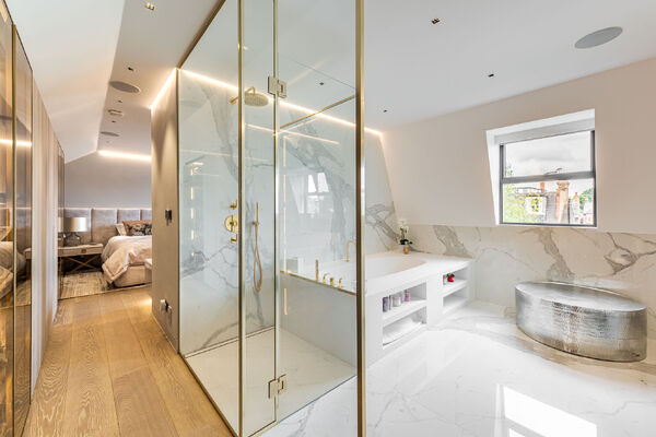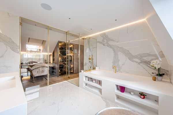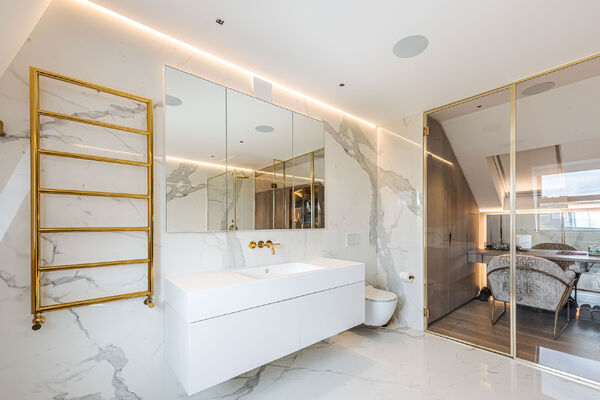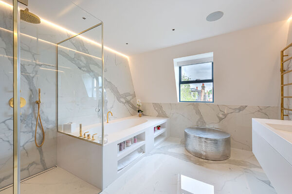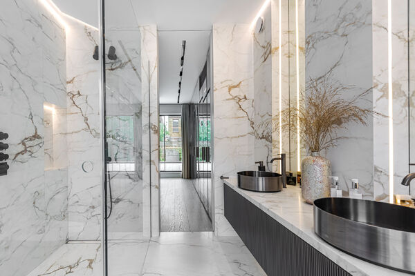 Modern, luxurious renovation with marble features.