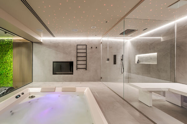 - Hot tub/steam room and waterfall shower