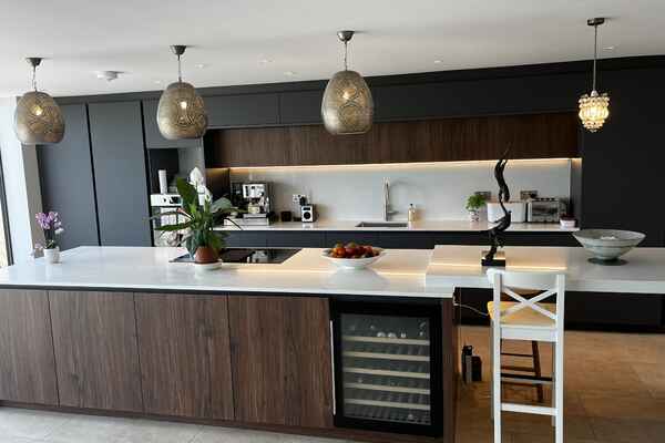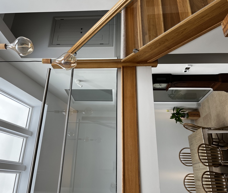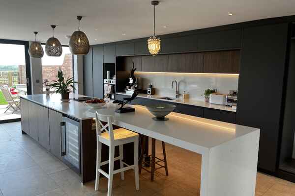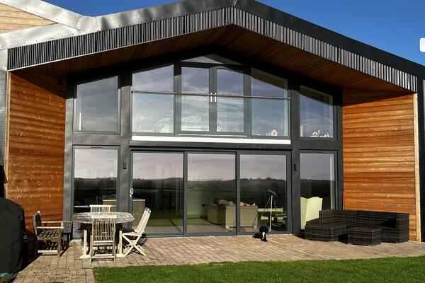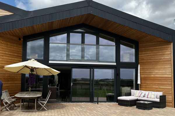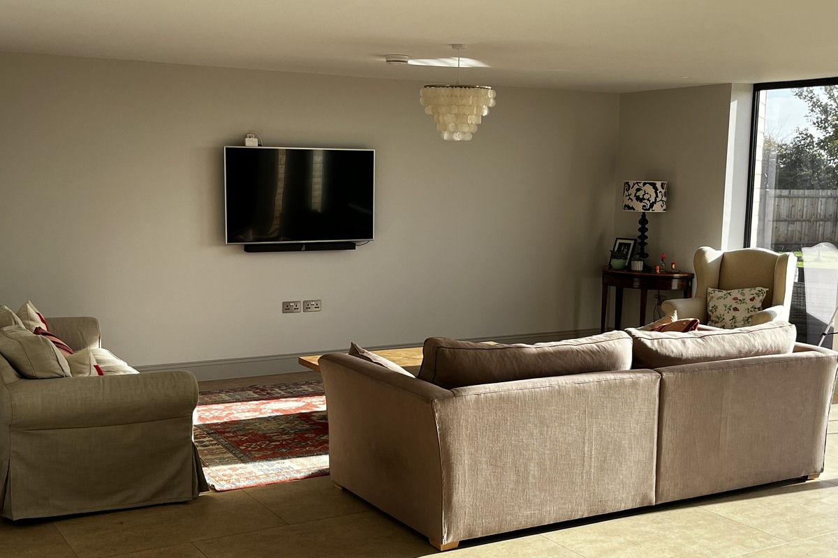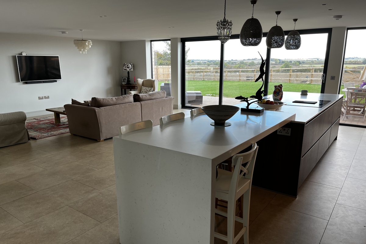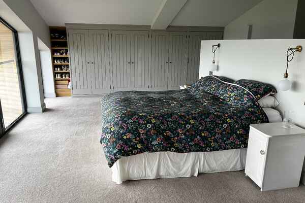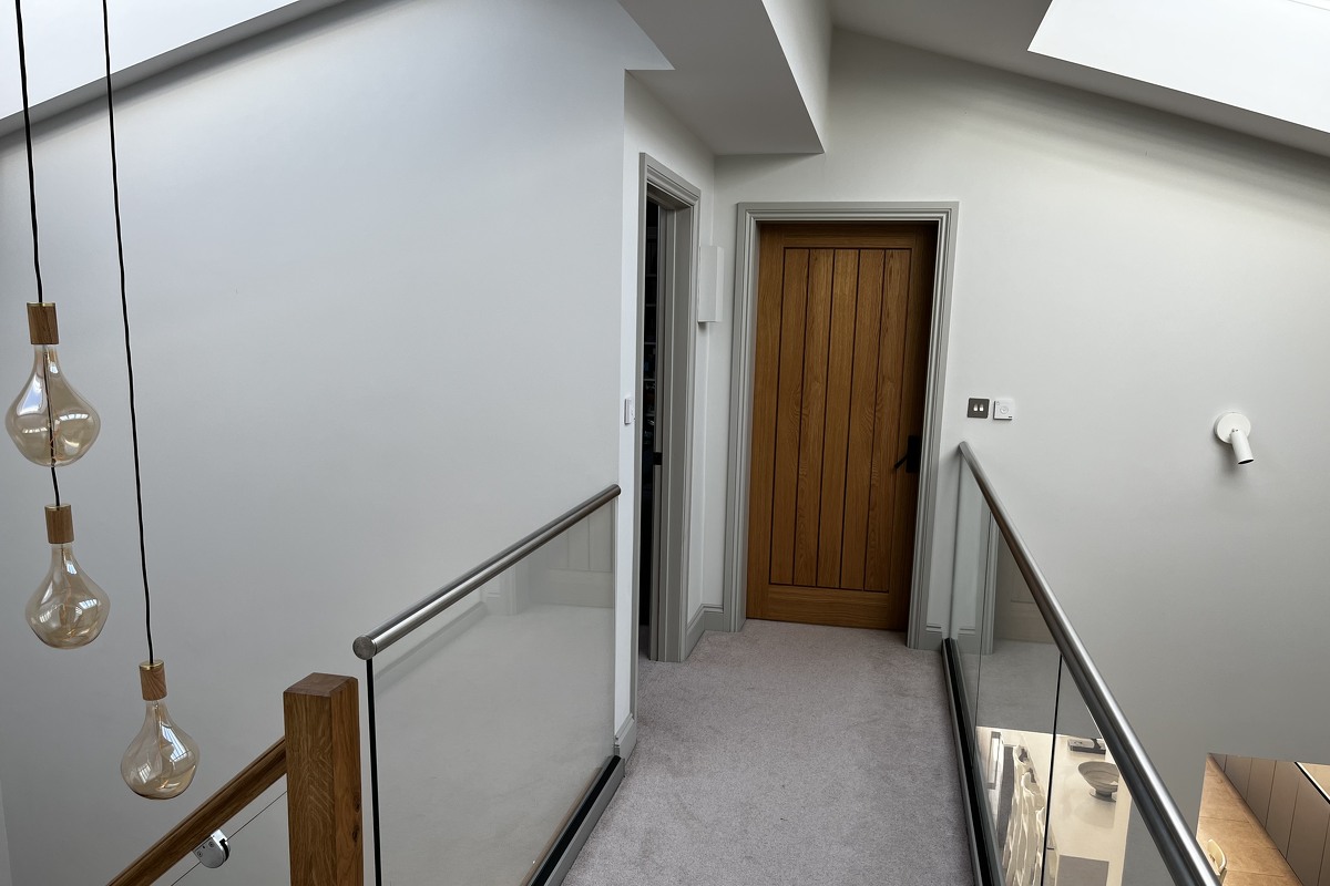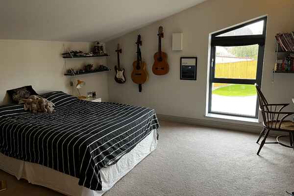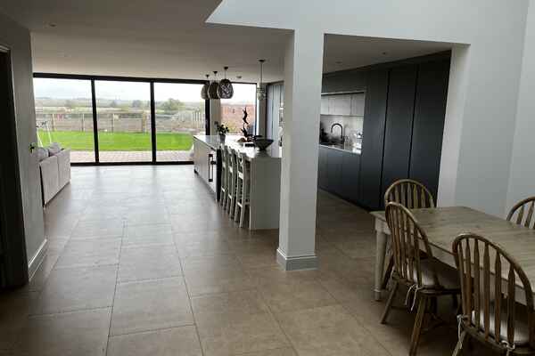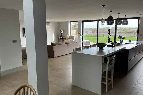 5/6 bedrooms. Open plan kitchen/dining/sitting room. Modern kitchen with island and breakfast bar. Large sliding glass doors to one end. Velux lightwell over stairs and dining area. American oak staircase with glass bannister. Separate sitting room. Large master bedroom with views and large glass windows and doors. Approx total space 3000sqft. Garden with patio and mainly laid to lawn. Gravel driveway.